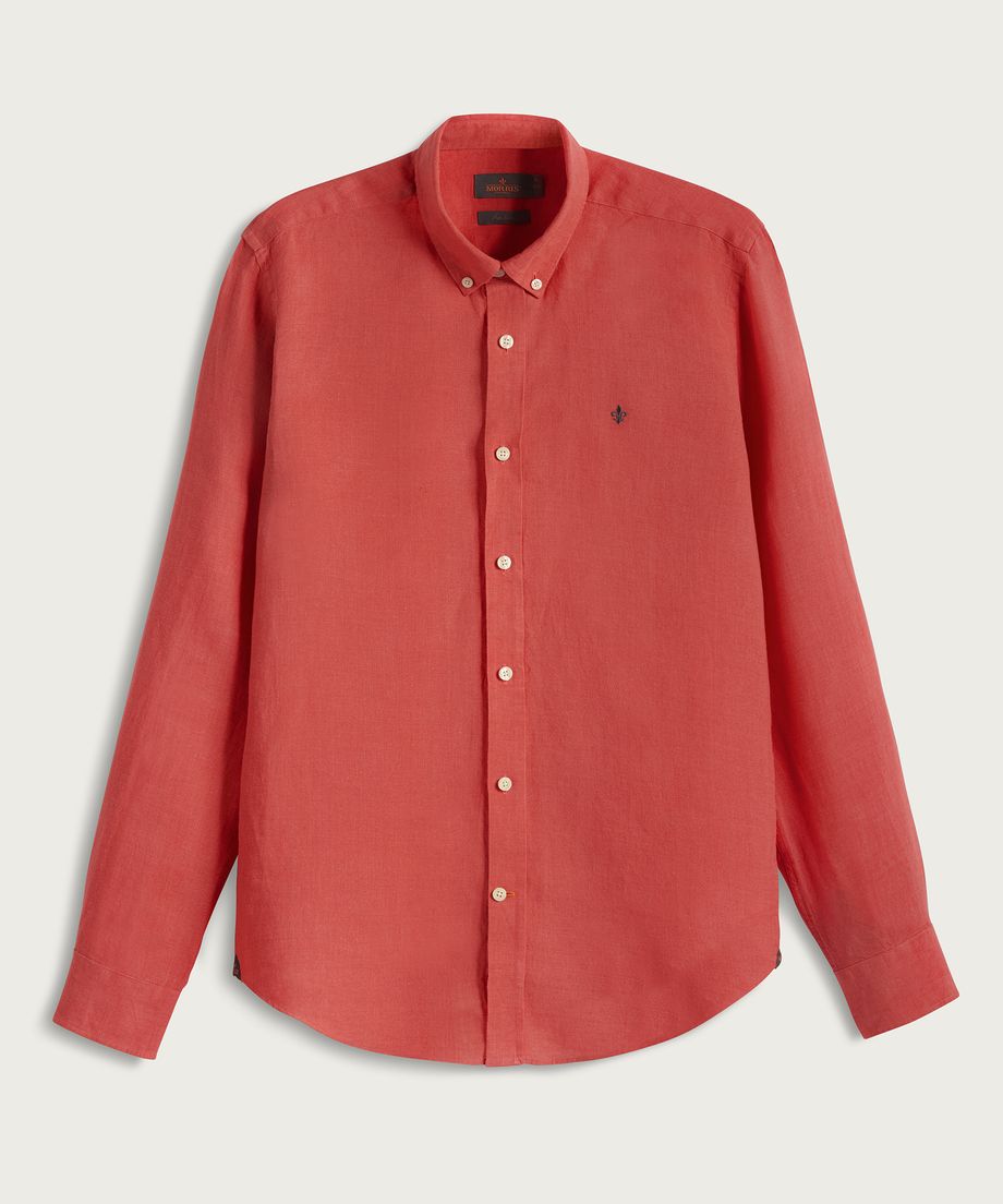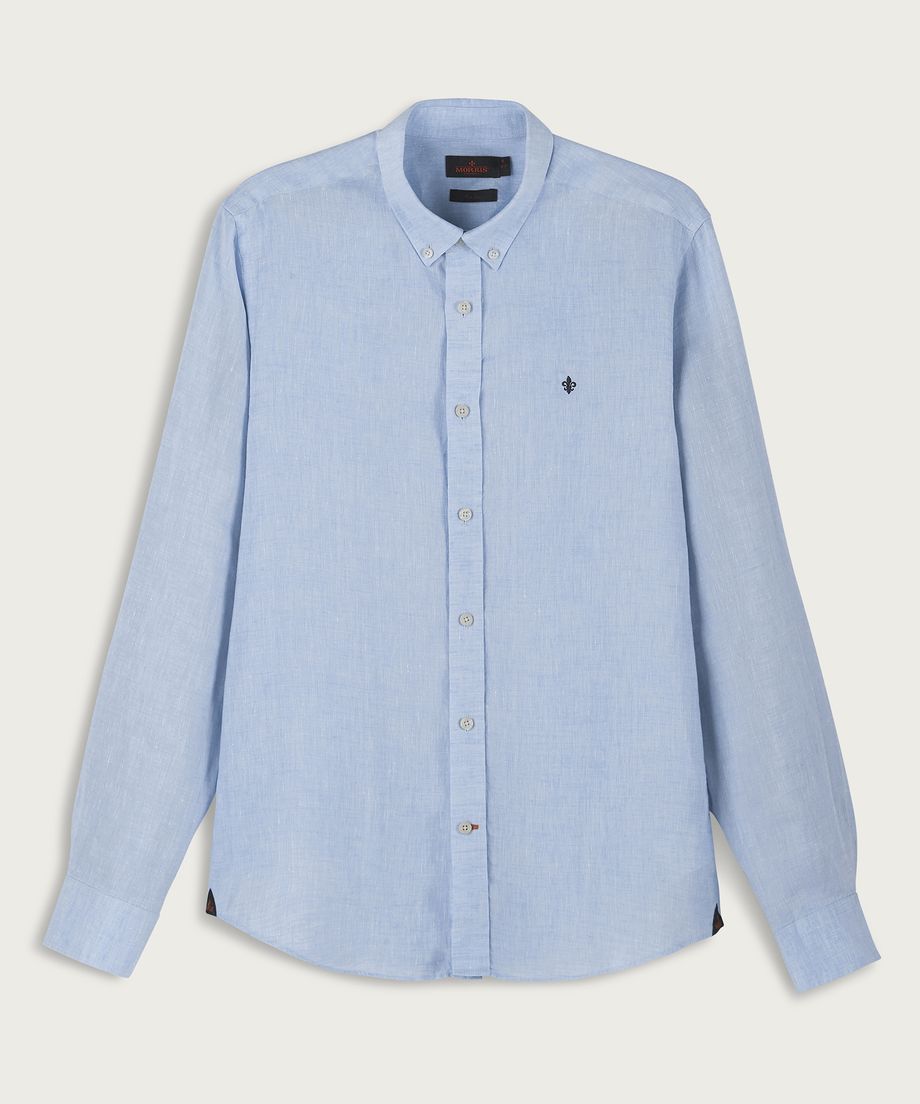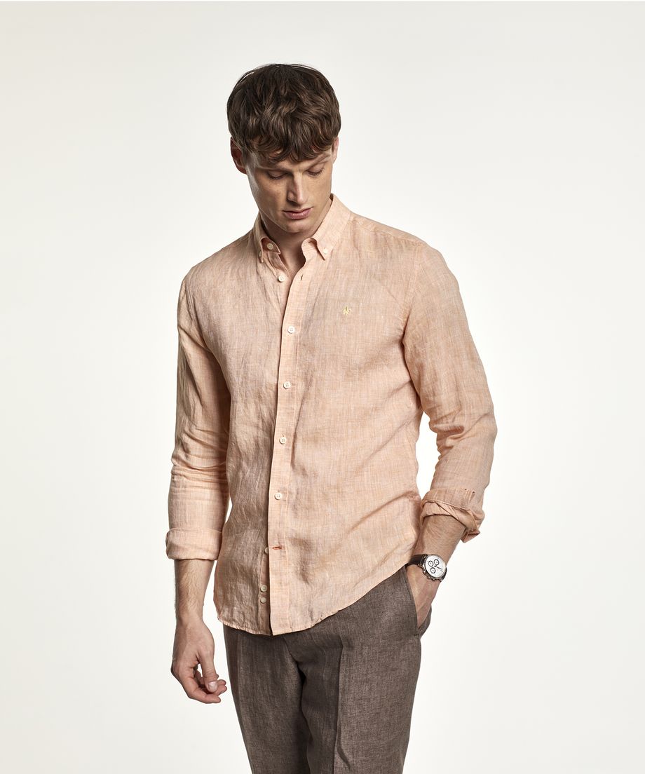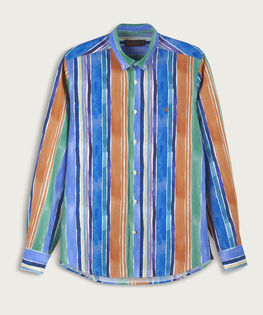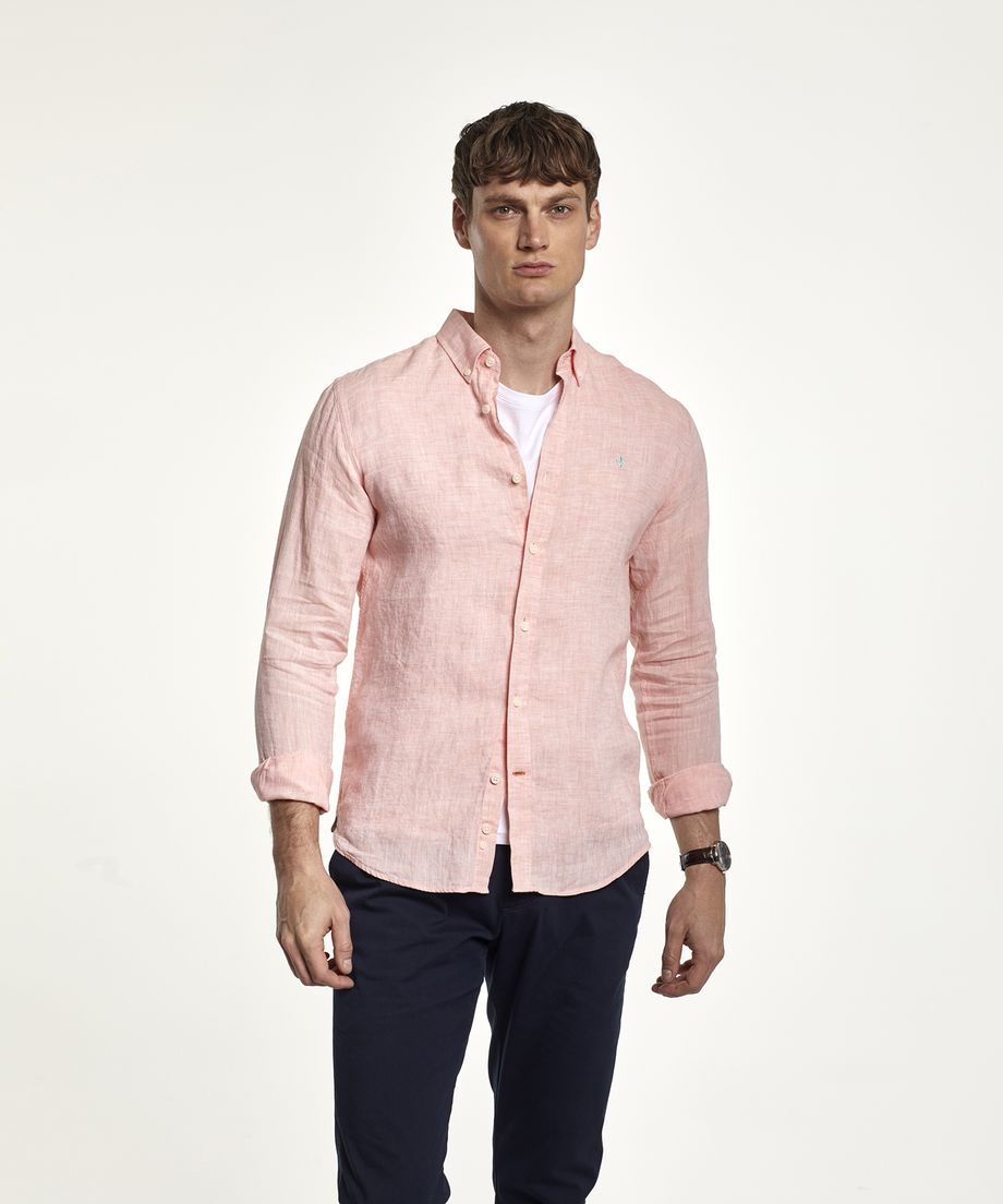 Linen shirt with a colourful and tropical print. The shirt has button down collar and long sleeve. Single cuff slightly rounded with two buttons.Regular fitEmbroidered lily at left chest100% Linen. Machine wash 30 degrees