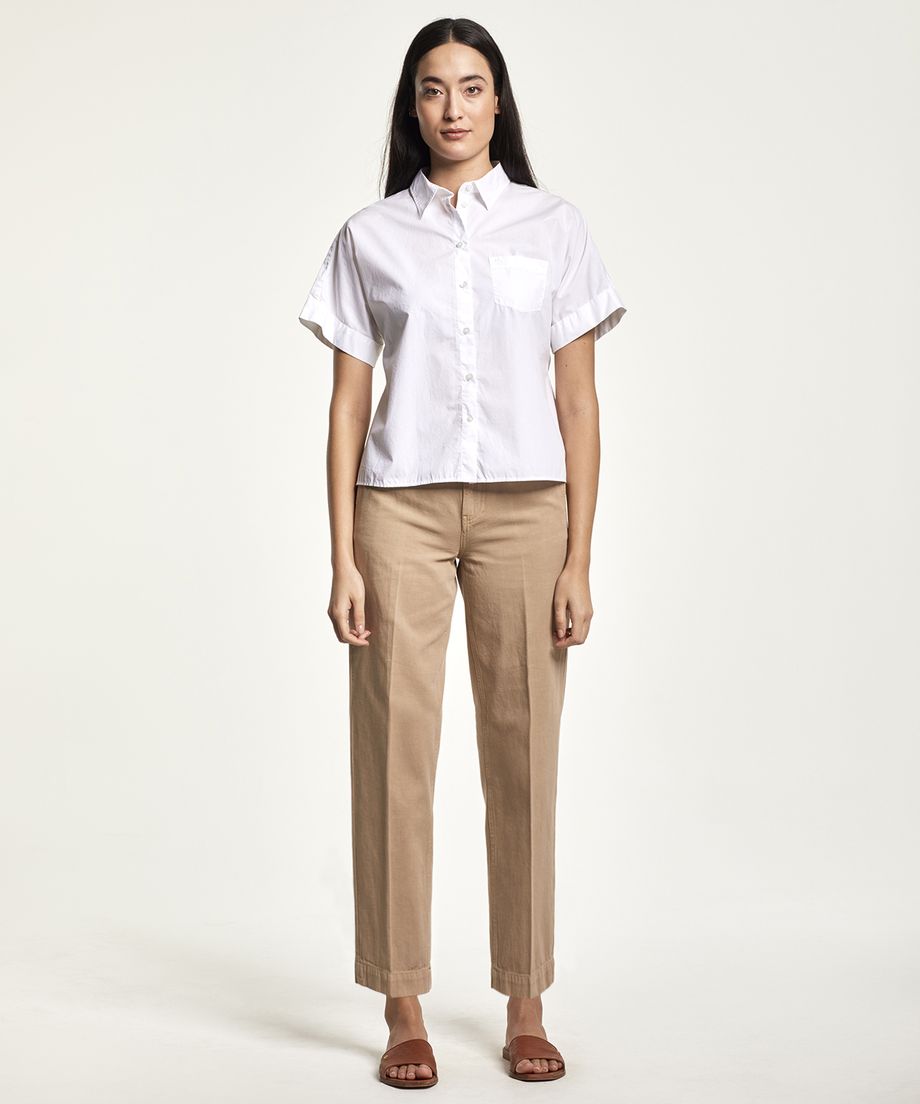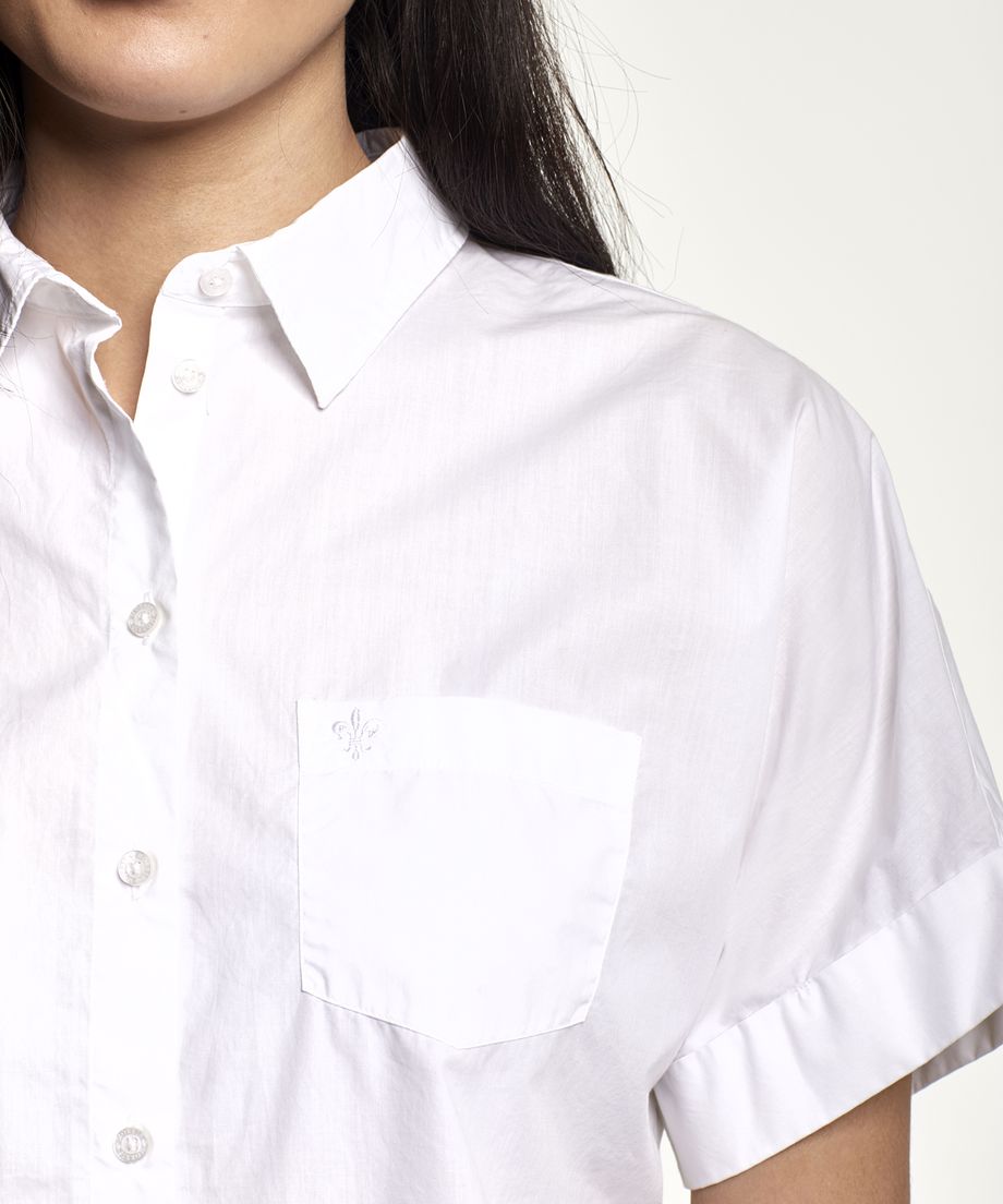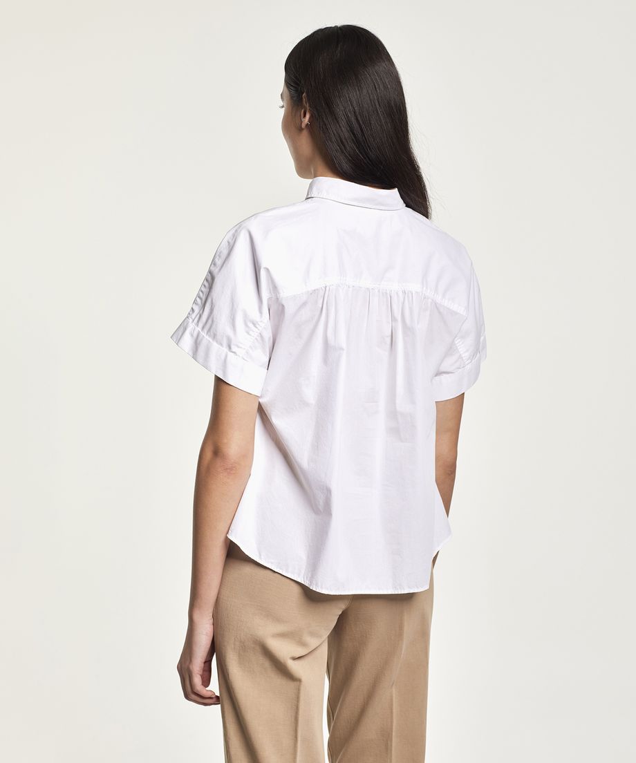Cotton shirt with short sleeve and turned up sleeve hem. The shirt has decorative gatherings along the yoke at back. Patch pocket at left chest. Normal fit. Embroidered lily at chest pocket100% CottonMachine wash 30 degrees. The model is 180 cm and wears size 36.
