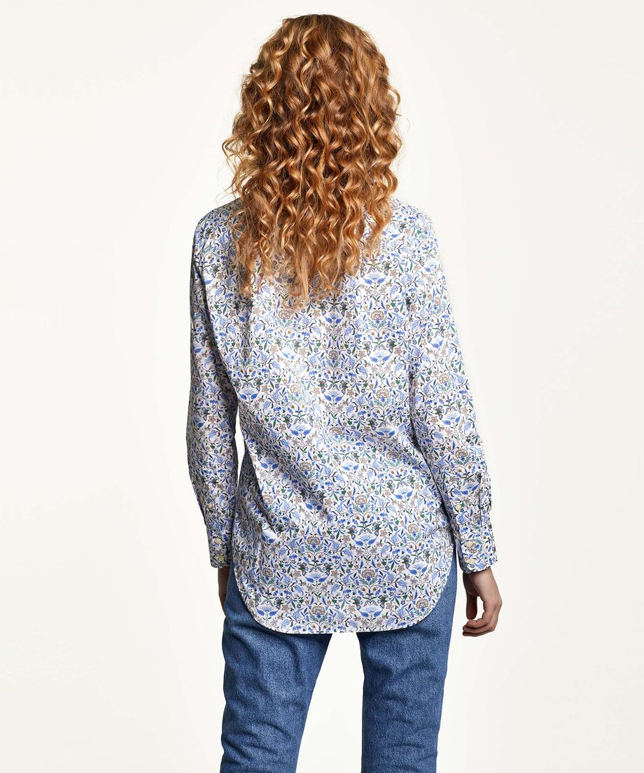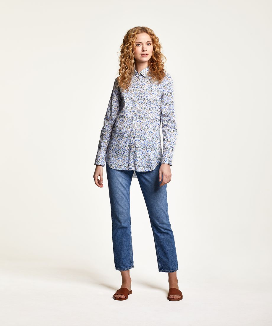 Ladys classic shirt Kirsten with loose fit and cut away collar with medium spread. The shirt is short at front and longer at back. Single cuff with two buttons. The shirt is made of flower printed fabrics from Liberty Art Fabrics. Embroidered lily at left chest.100% CottonMachine wash 30 degrees