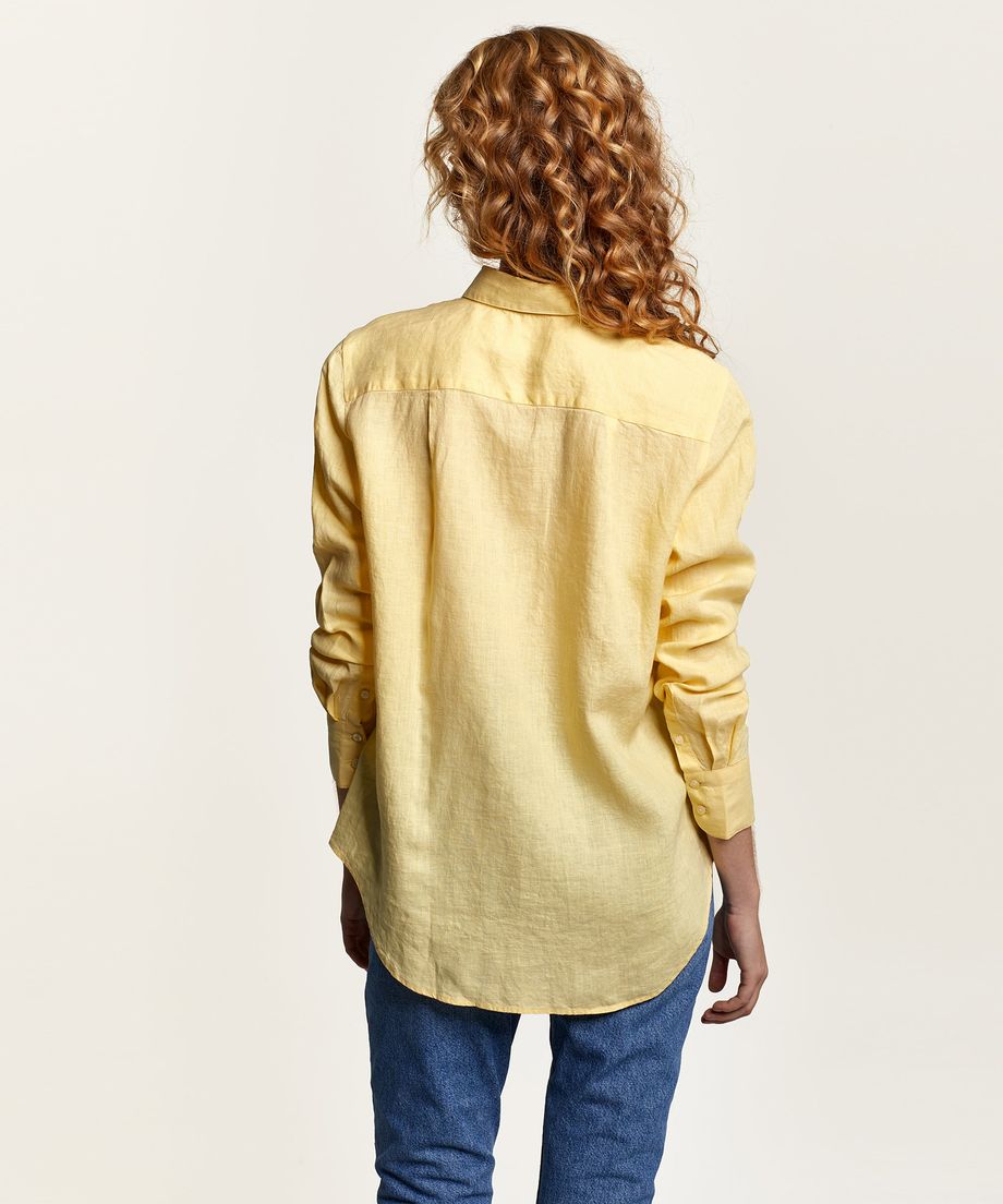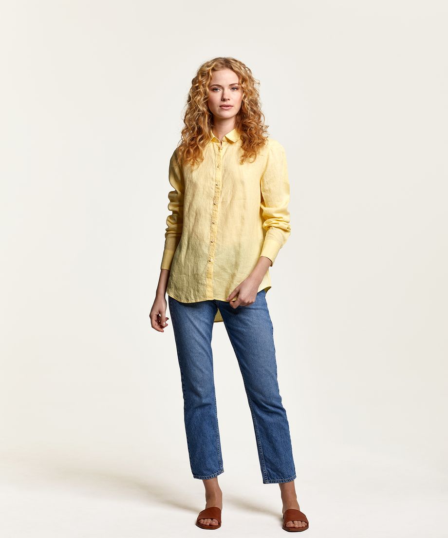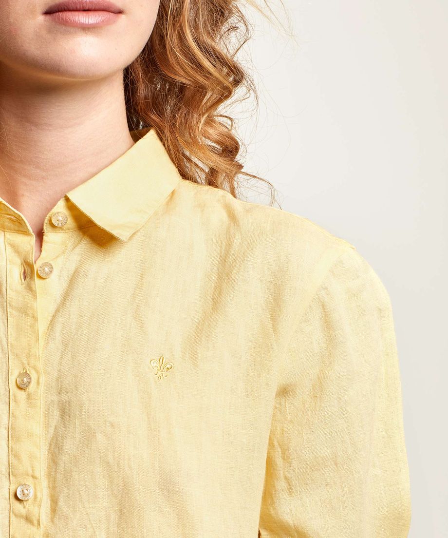 Ladys classic linen shirt Kirsten with loose fit and cut away collar with medium spread. The shirt is short at front and longer at back. Single cuff with two buttons. Embroidered lily at left chest.100% Linen. Machine wash 30 degrees
