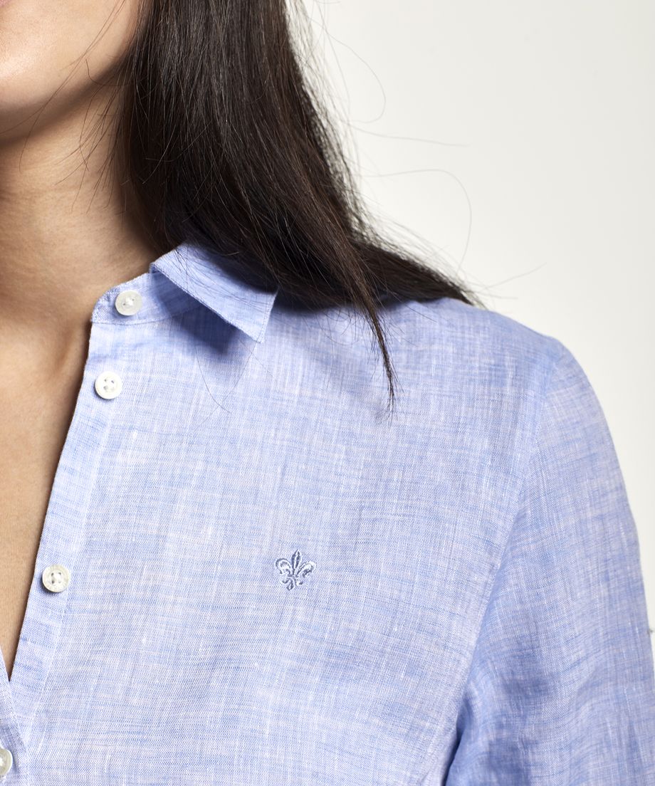 Ladys classic linen shirt Kirsten with loose fit and cut away collar with medium spread. The shirt is short at front and longer at back. Single cuff with two buttons. Embroidered lily at left chest.100% Linen. Machine wash 30 degrees