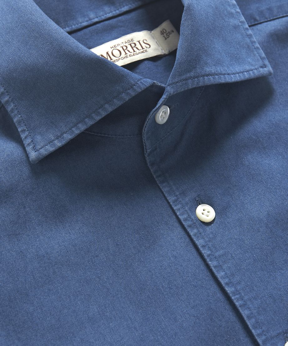 Premium shirt with one piece collar, where the collar is sewn together with the placket in one piece, for an interesting look. The shirt is made of an indigo dyed cotton fabric from the Italian weaver Albini. The fabric has undergone a special indigo dyeing that the gives the garment its unique shade of blue colour, and over time the colour will get more character. The shirt has a single cuff slightly rounded with two buttons. The buttons on the shirt are made of real Mother of Pearl. Normal fit. Embroidered lily at placket on sleeveHandle the shirt carefully and do not expose to direct sunlight100% Cotton30 degree machine wash
