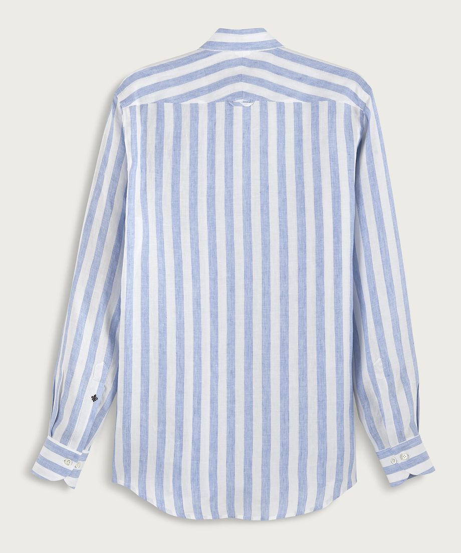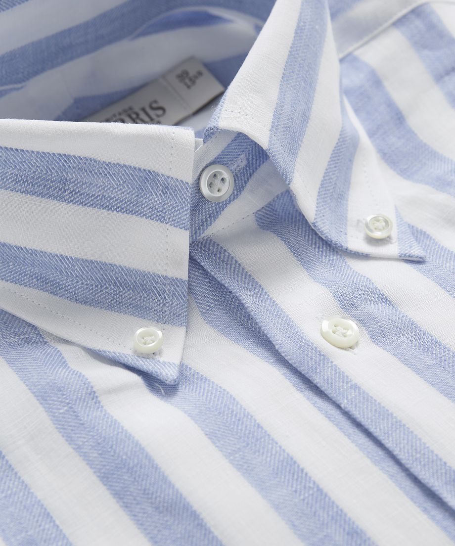 Premium linen shirt with button down collar, made of a striped fabric from the Italian weaver Monti. The shirt has a single cuff slightly rounded with two buttons. The buttons on the shirt are made of real Mother of Pearl. Normal fit. Embroidered lily at placket on sleeve100% Linen30 degree machine wash