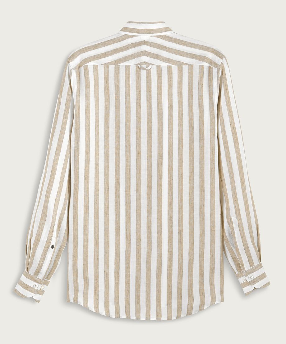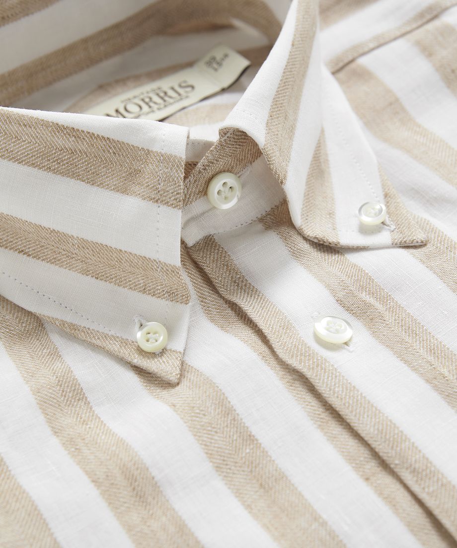Premium linen shirt with button down collar, made of a striped fabric from the Italian weaver Monti. The shirt has a single cuff slightly rounded with two buttons. The buttons on the shirt are made of real Mother of Pearl. Normal fit. Embroidered lily at placket on sleeve100% Linen30 degree machine wash