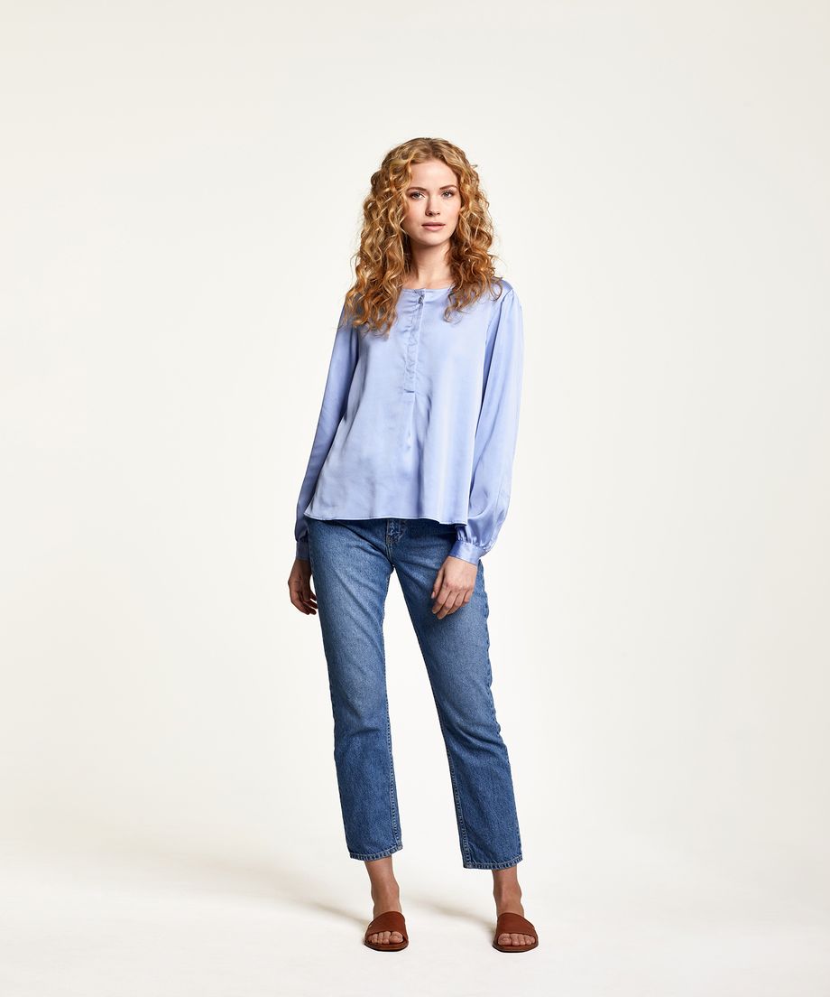 Lady blouse with slight A-line shape and long puff sleeve with cuff and fabric covered button. The blouse has a hidden button placket and a fabric covered button placed at centre front. Normal fit100% PolyesterMachine wash 30 degrees