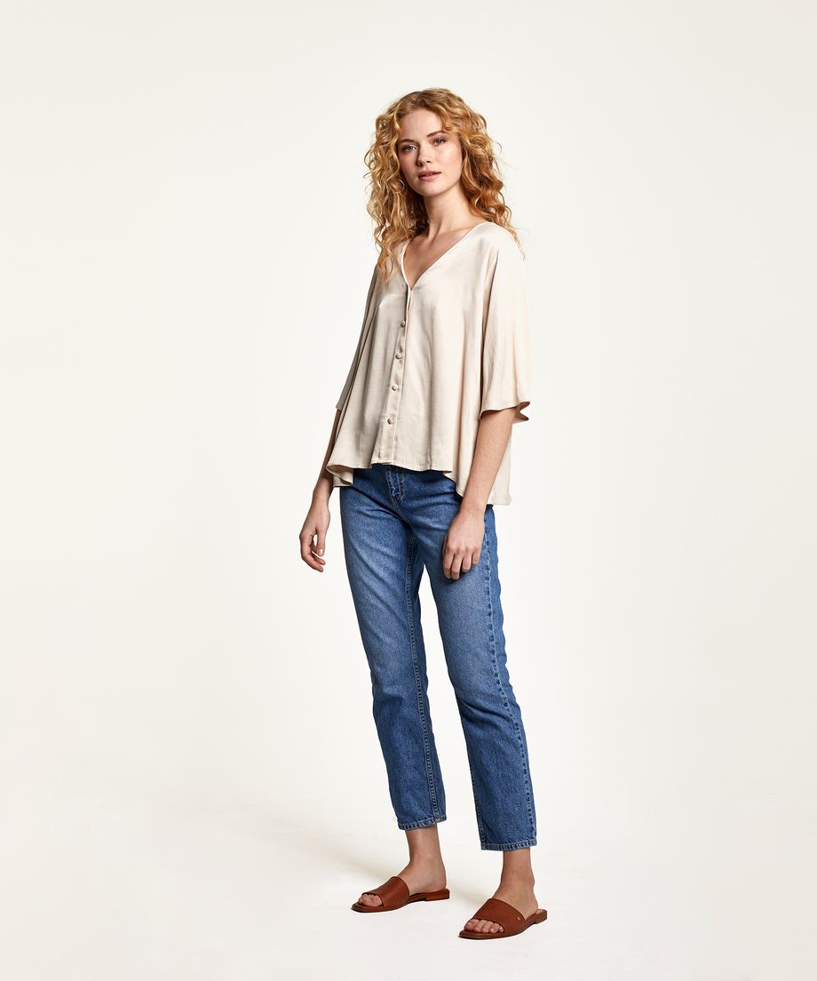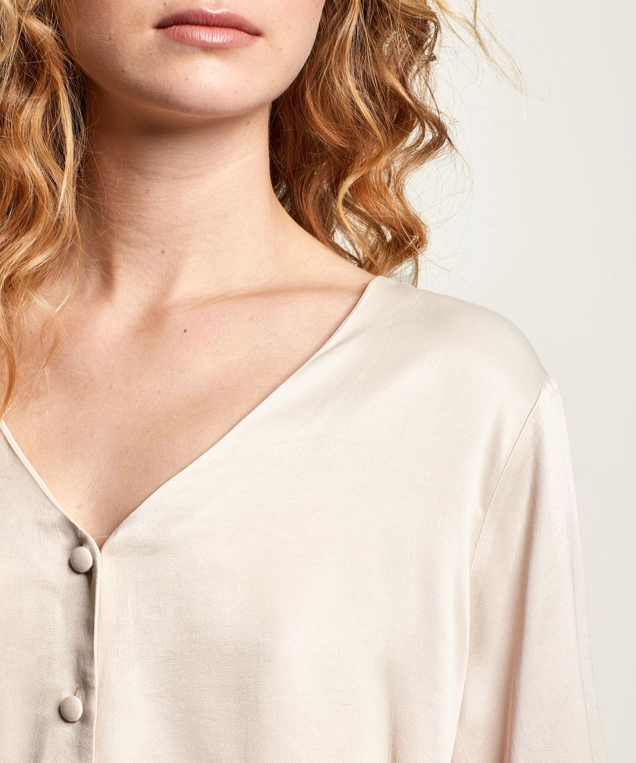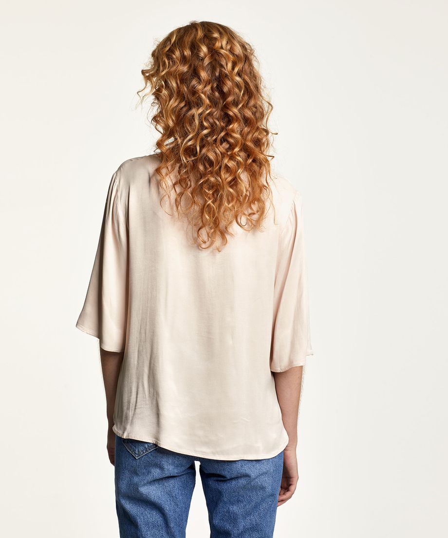 Lady blouse with V-neckline and fabric covered buttons at front. The blouse has a slight A-lined shape and a short, flared sleeve. Normal fit100% PolyesterMachine wash 30 degrees. The model is 176 cm and wears size 36.