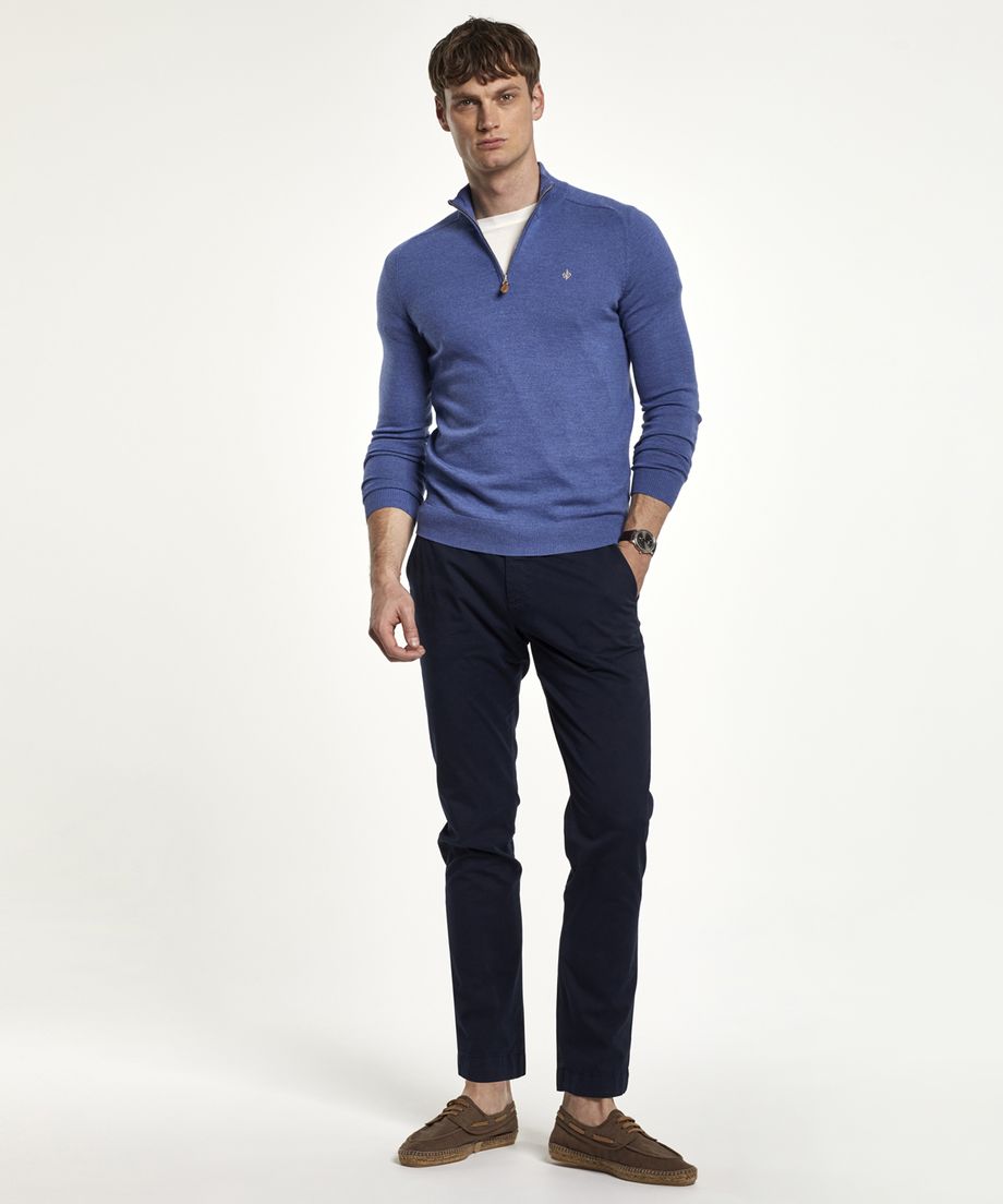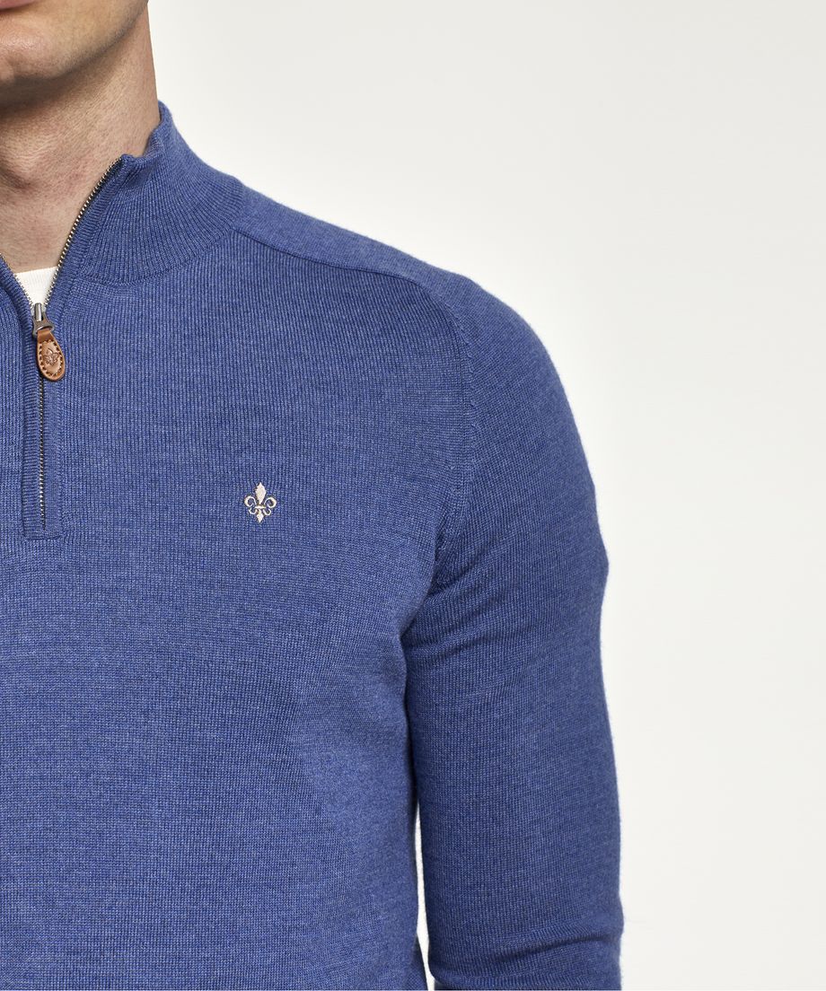 Popular knitted sweater with a ribbed funnel neck and half zip in metal at front. Ribs at cuff and bottom hem. The sweater is made of merino wool from Biella Südwolle. Normal fit. Embroidered lily at left chest100% Merino WoolHand wash