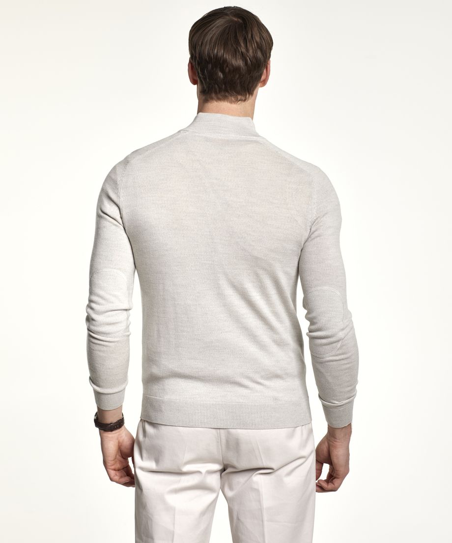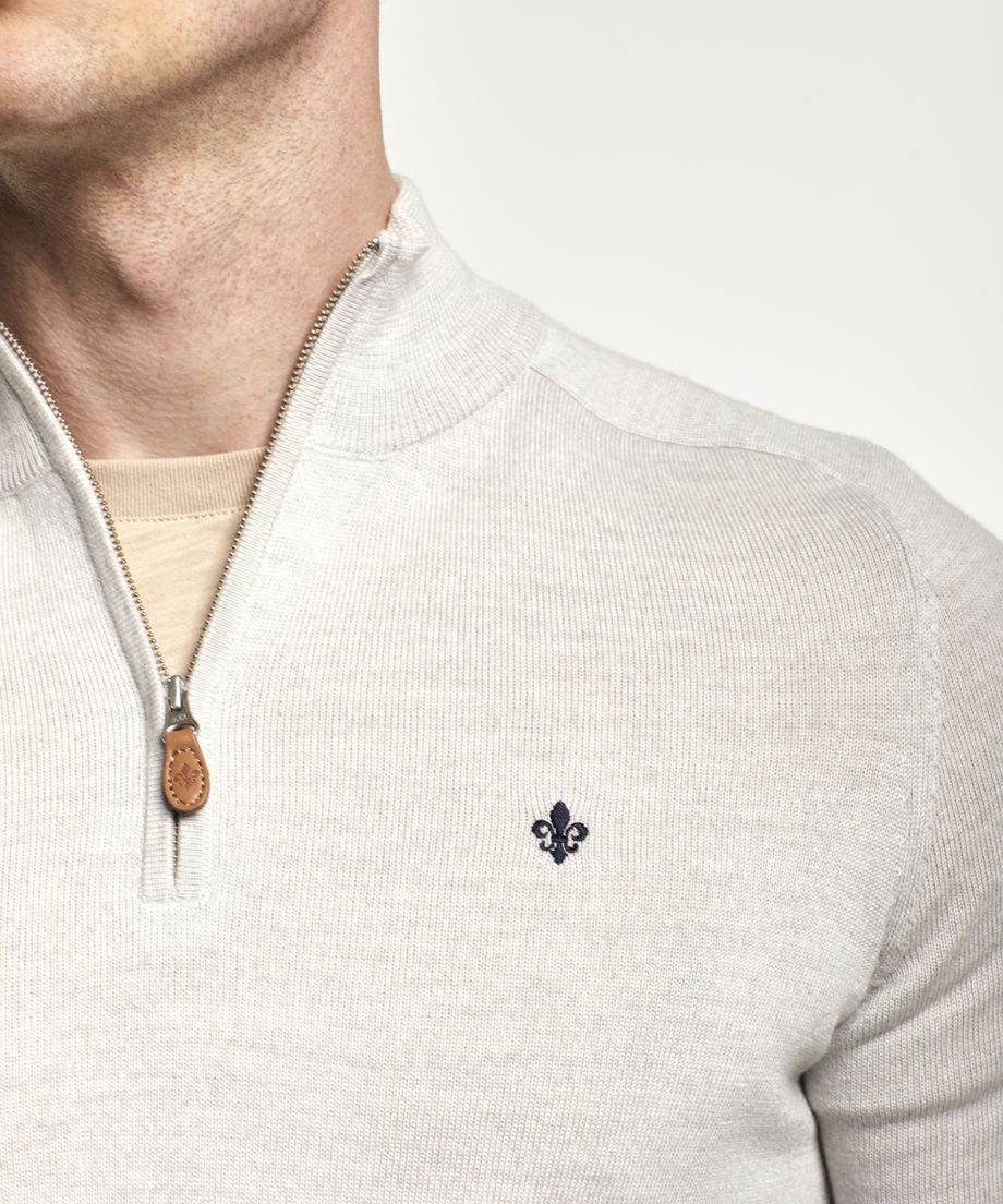 Popular knitted sweater with a ribbed funnel neck and half zip in metal at front. Ribs at cuff and bottom hem. The sweater is made of merino wool from Biella Südwolle. Normal fit. Embroidered lily at left chest100% Merino WoolHand wash