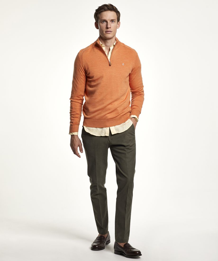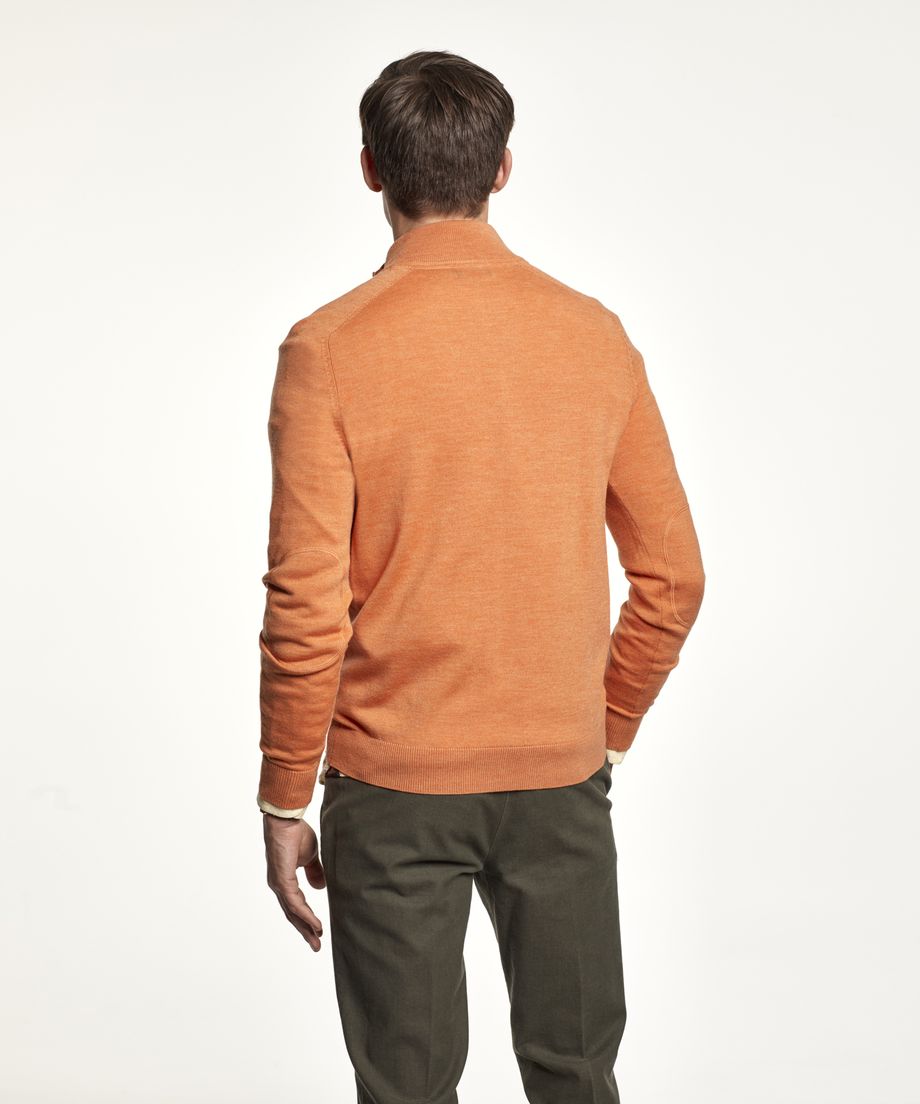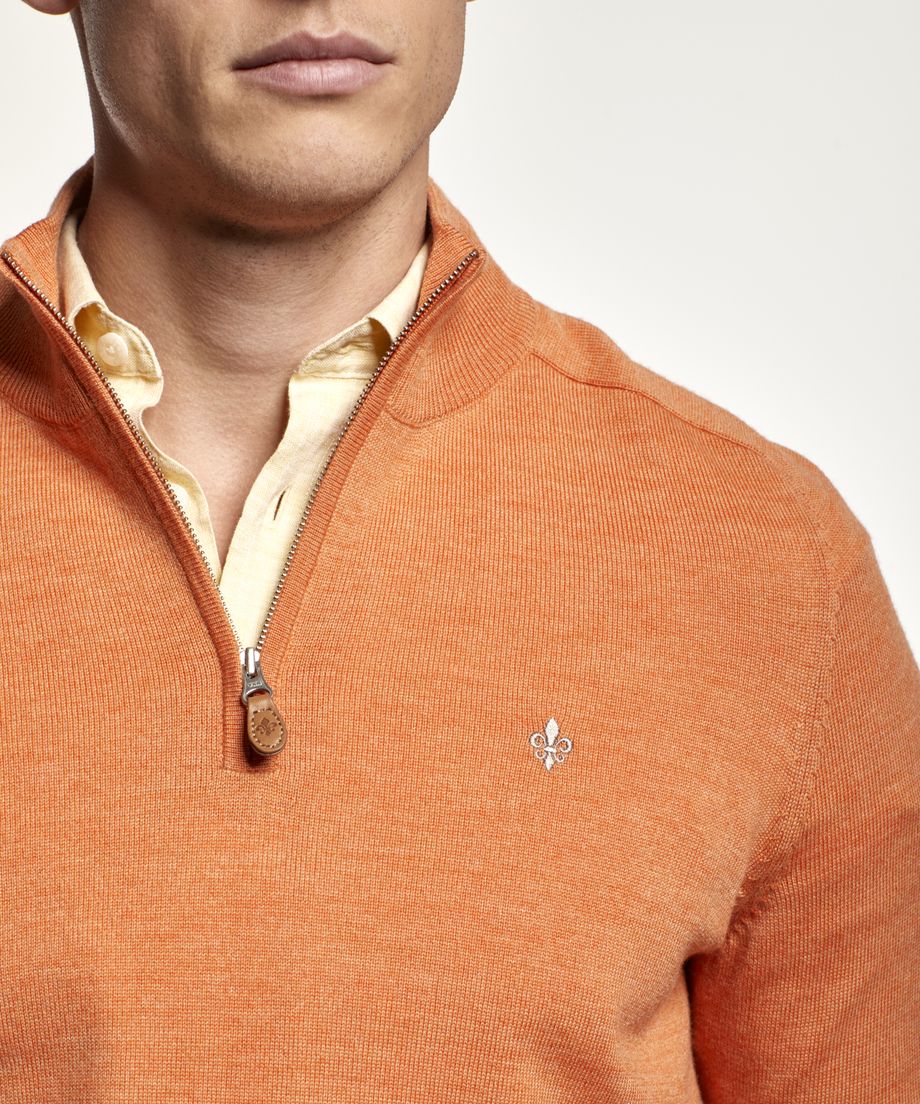 Popular knitted sweater with a ribbed funnel neck and half zip in metal at front. Ribs at cuff and bottom hem. The sweater is made of merino wool from Biella Südwolle. Normal fit. Embroidered lily at left chest100% Merino WoolHand wash