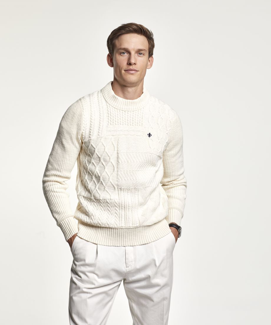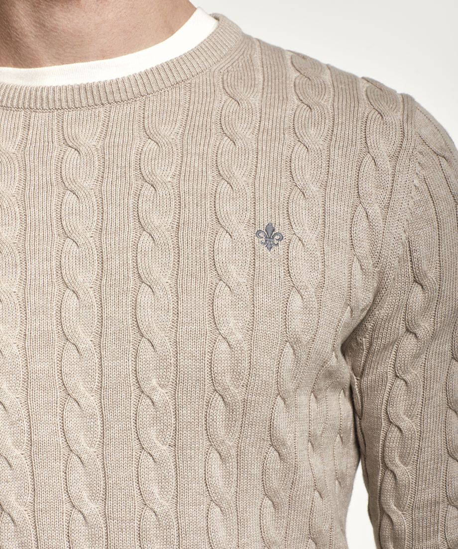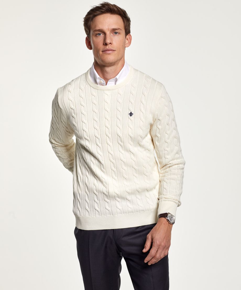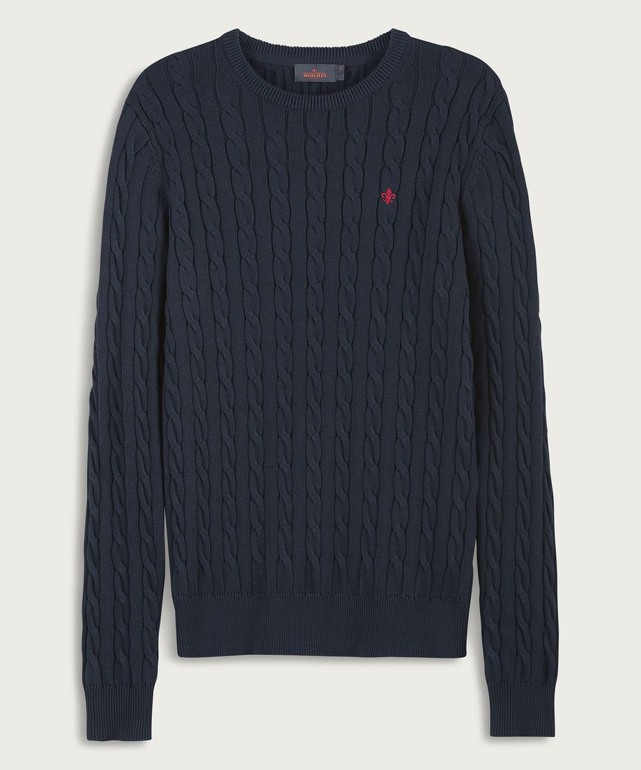 Classic cable knit in pima cotton, with oneck and ribs at cuff and bottom hem. Pima cotton is an extra-long cotton fiber, that gives a softer handfeel and lustre. Normal fit. Embroidered lily at left chest100% CottonHand wash