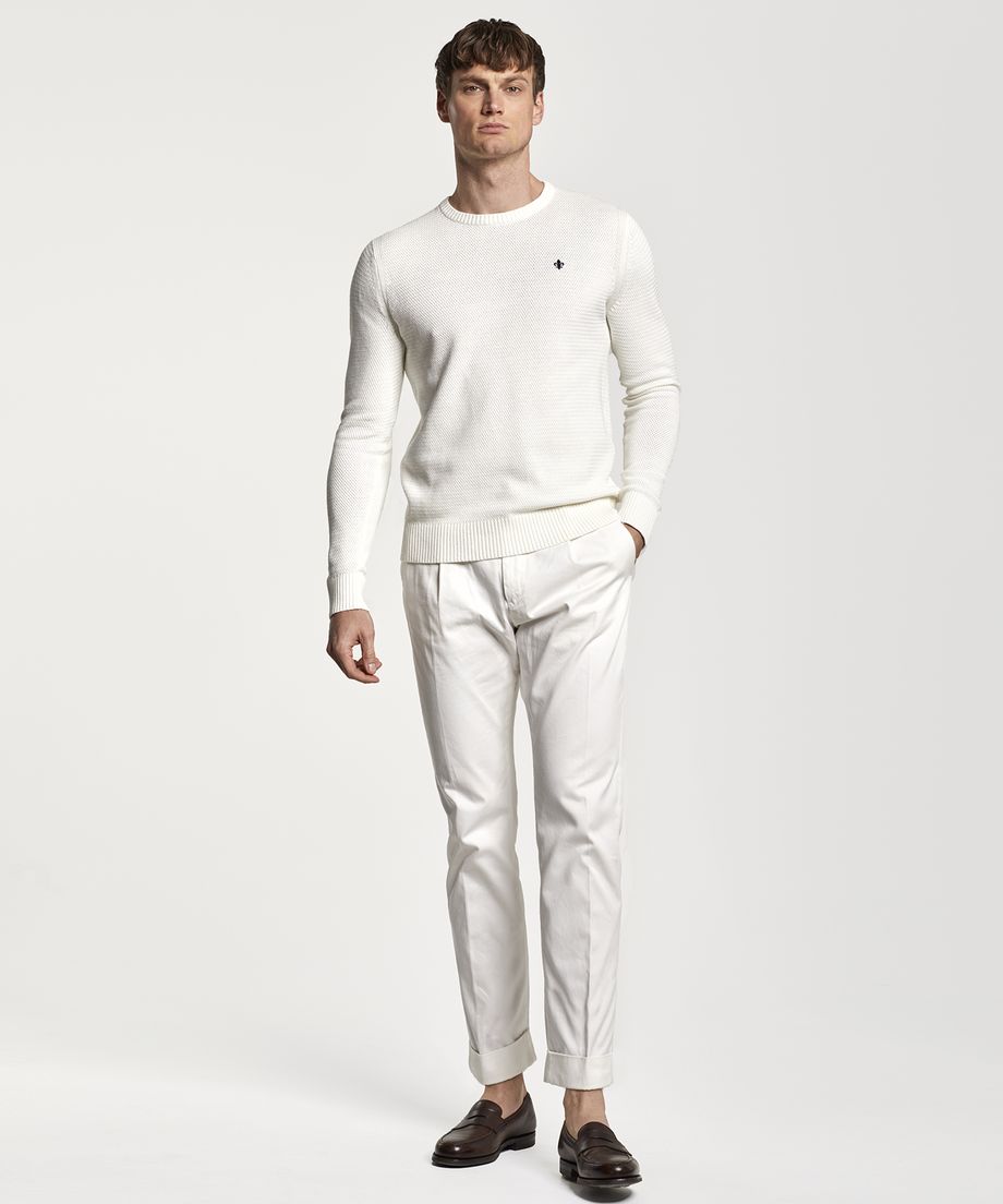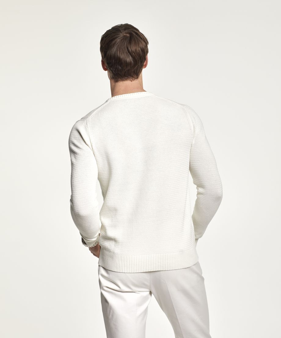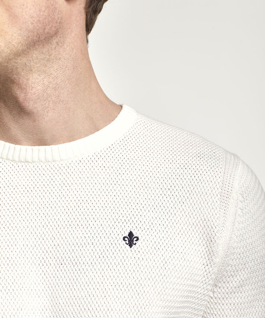 Pattern knitted oneck, knitted with a knitting technique called tuck stitch. The sweater is knitted in a cotton and linen yarn, which gives the garment a nice structure and handfeel. The stitching around armhole is decorated with broad fully fashion stitchings. Ribs at cuff and bottom hem. Normal fit. Embroidered lily at left chest70% Cotton, 30% LinenHand washThe model is 189 cm and wears size M.