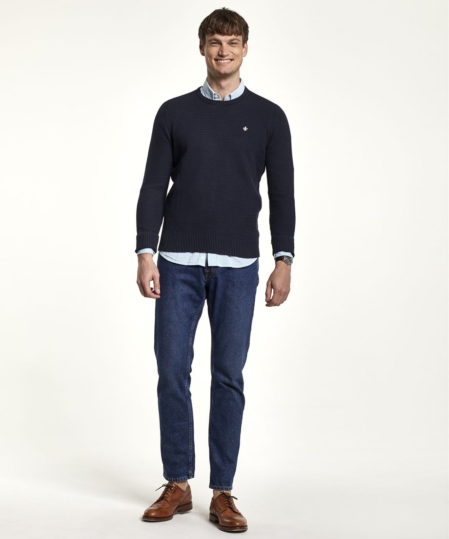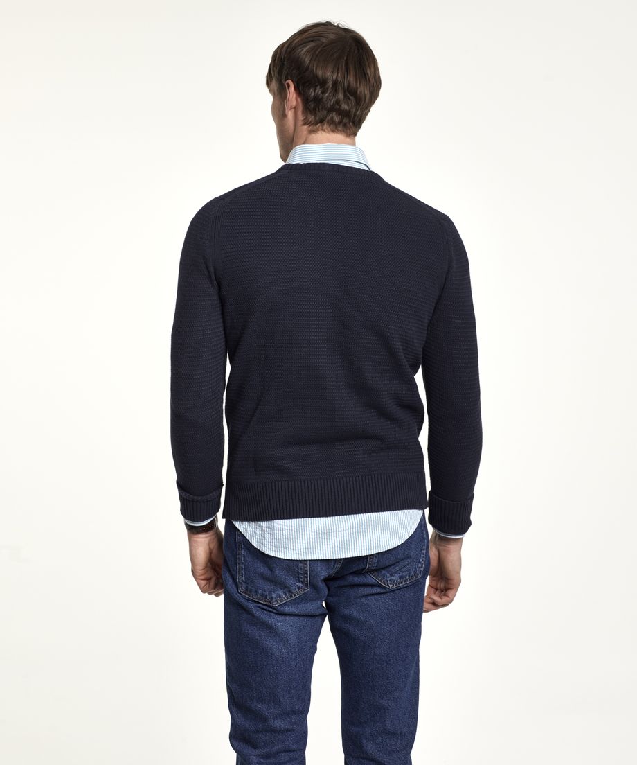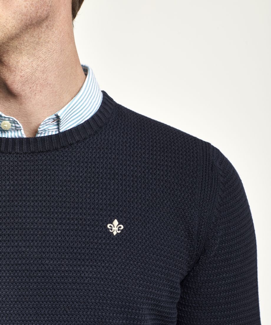 Pattern knitted oneck, knitted with a knitting technique called tuck stitch. The sweater is knitted in a cotton and linen yarn, which gives the garment a nice structure and handfeel. The stitching around armhole is decorated with broad fully fashion stitchings. Ribs at cuff and bottom hem. Normal fit. Embroidered lily at left chest70% Cotton, 30% LinenHand washThe model is 189 cm and wears size M.
