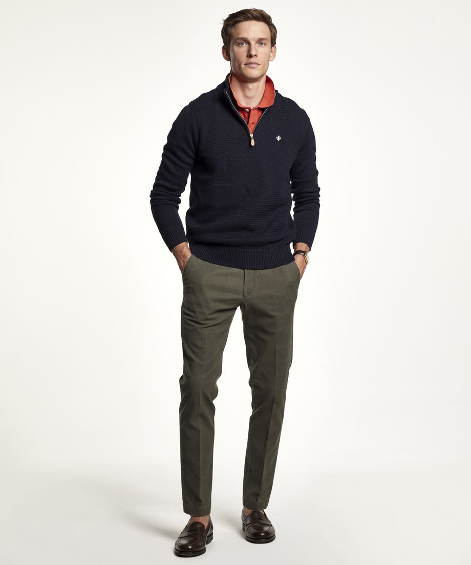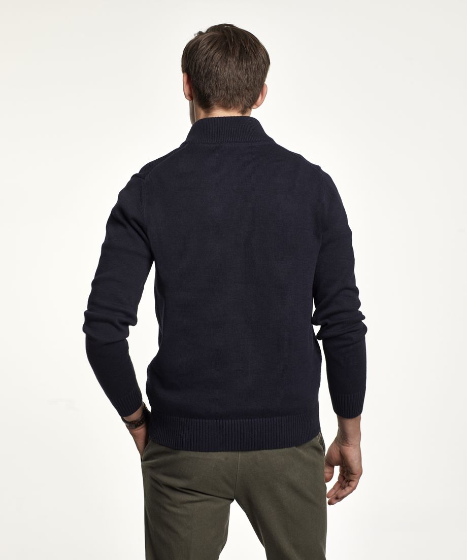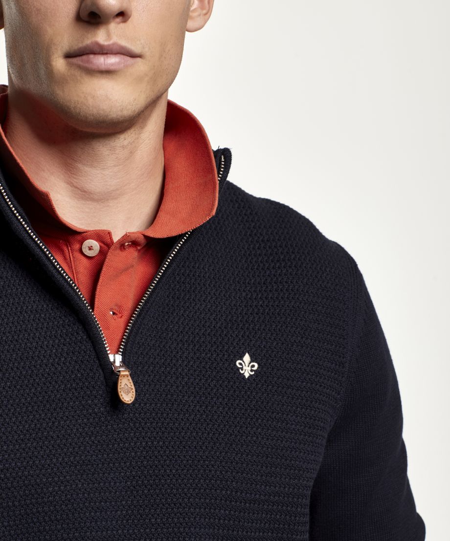 Sweater with a pattern knitted front, in our popular style with a ribbed funnel neck and half zip in metal at front. The sweater is knitted with a knitting technique called tuck stitch, in a cotton and linen yarn which gives the garment a nice structure and handfeel. The stitching around armhole is decorated with broad fully fashion stitchings. Ribs at cuff and bottom hem. Normal fit. Embroidered lily at left chest70% Cotton, 30% LinenHand washThe model is 184 cm and wears size M.