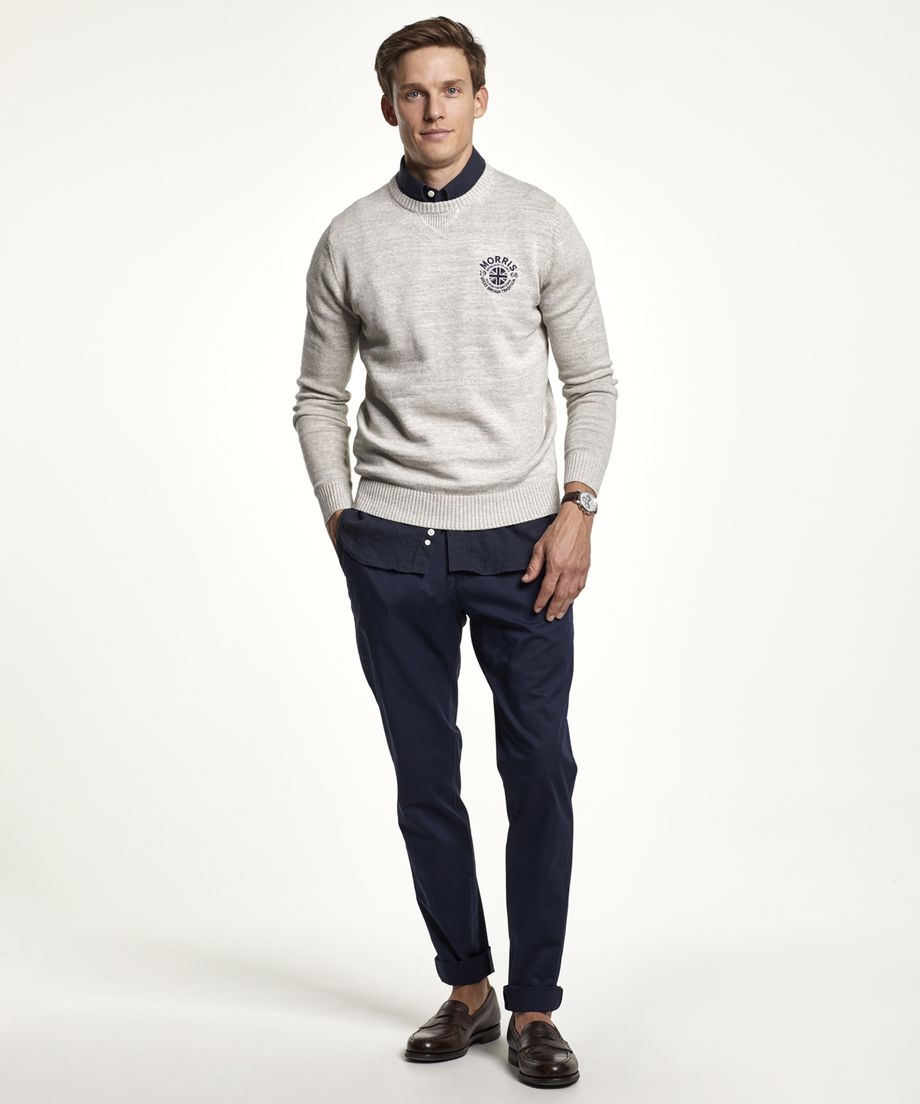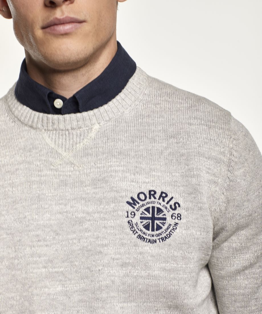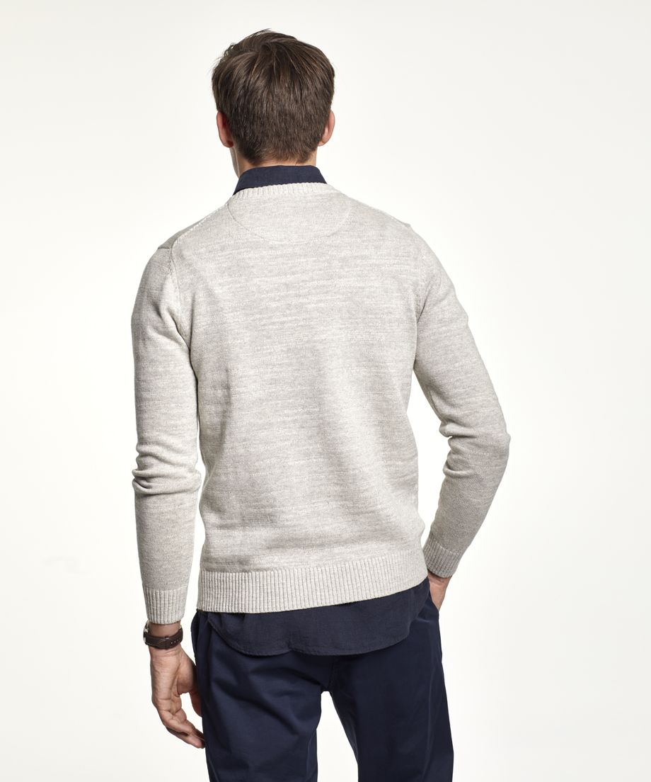 Knitted sweater with crew neck, knitted in a cotton yarn with structure and melange colours. The sweater has a ribbed triangle shaped detail at front. Ribs at cuff and bottom hemNormal fitEmbroidere. Flag patch at chest100% CottonHand wash