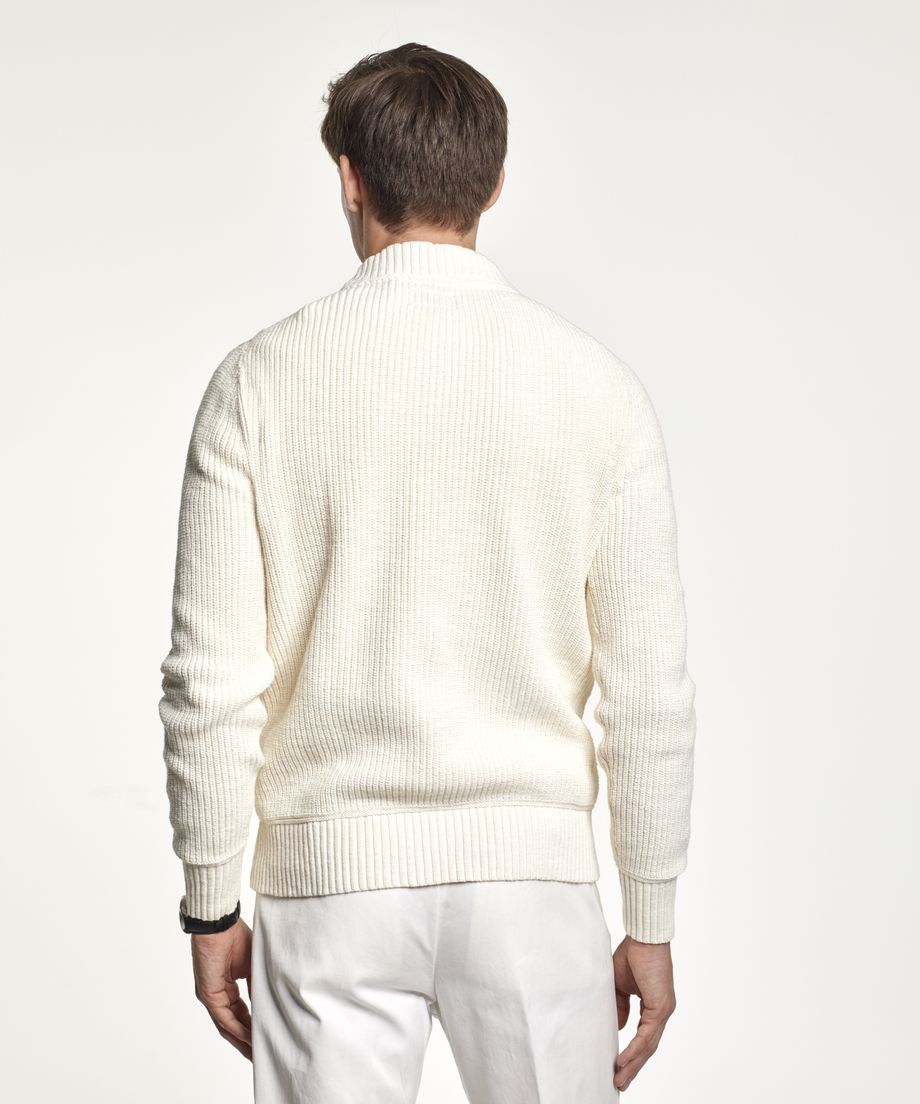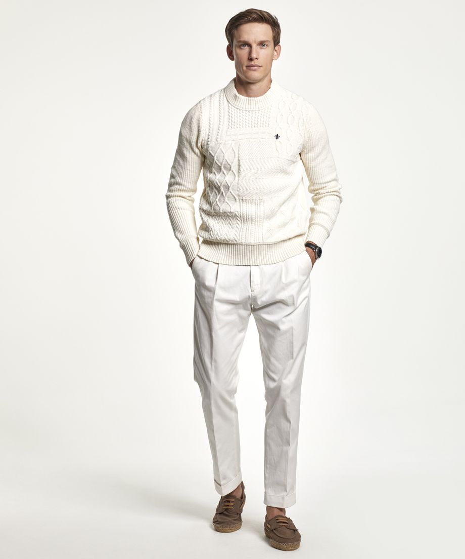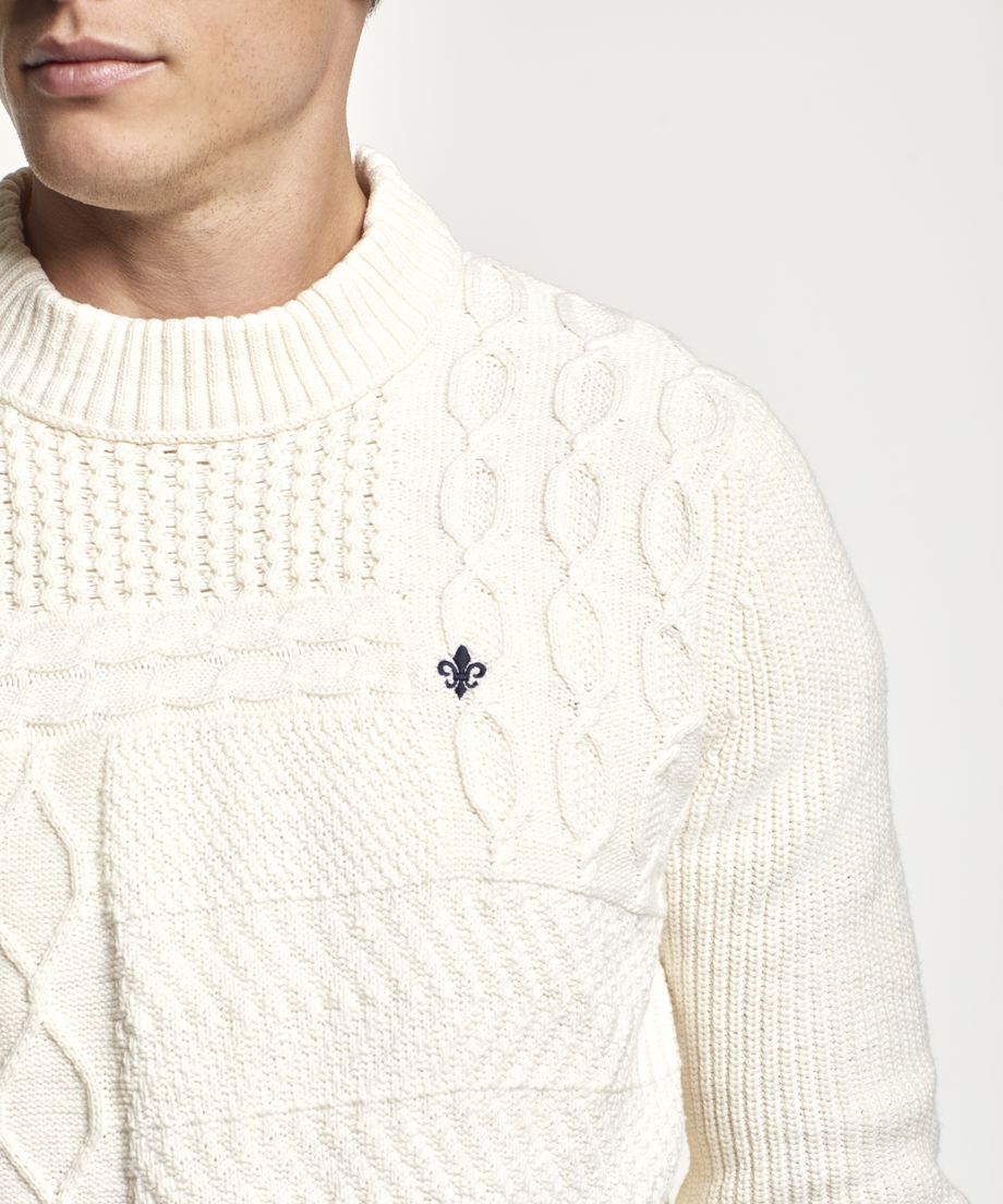 Knitted sweater with a front decorated with different cable patterns, that create a patchwork. Back and sleeves are patent knitted with a decorative knitted stripe above the ribbed cuffs and bottom hem. The neck is ribbed and slightly higher. Normal fit. Embroidered lily at left chest100% CottonHand wash