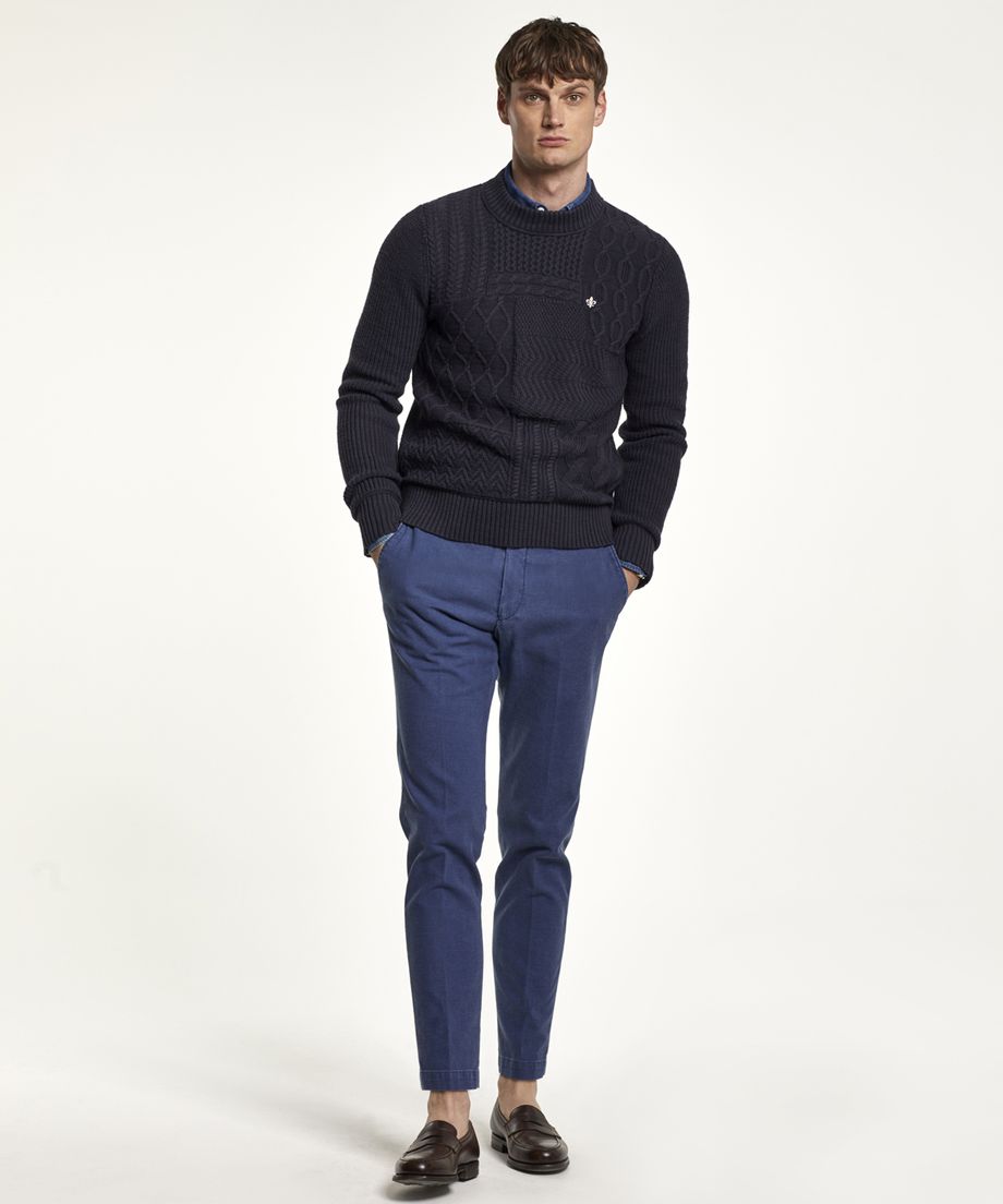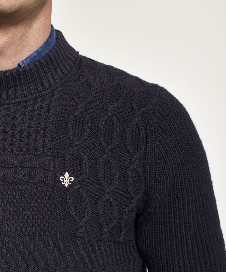 Knitted sweater with a front decorated with different cable patterns, that create a patchwork. Back and sleeves are patent knitted with a decorative knitted stripe above the ribbed cuffs and bottom hem. The neck is ribbed and slightly higher. Normal fit. Embroidered lily at left chest100% CottonHand wash