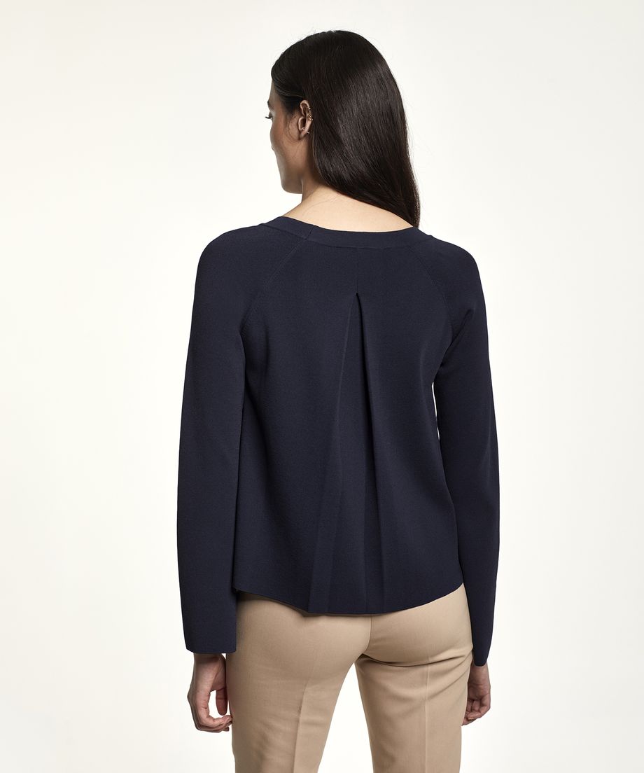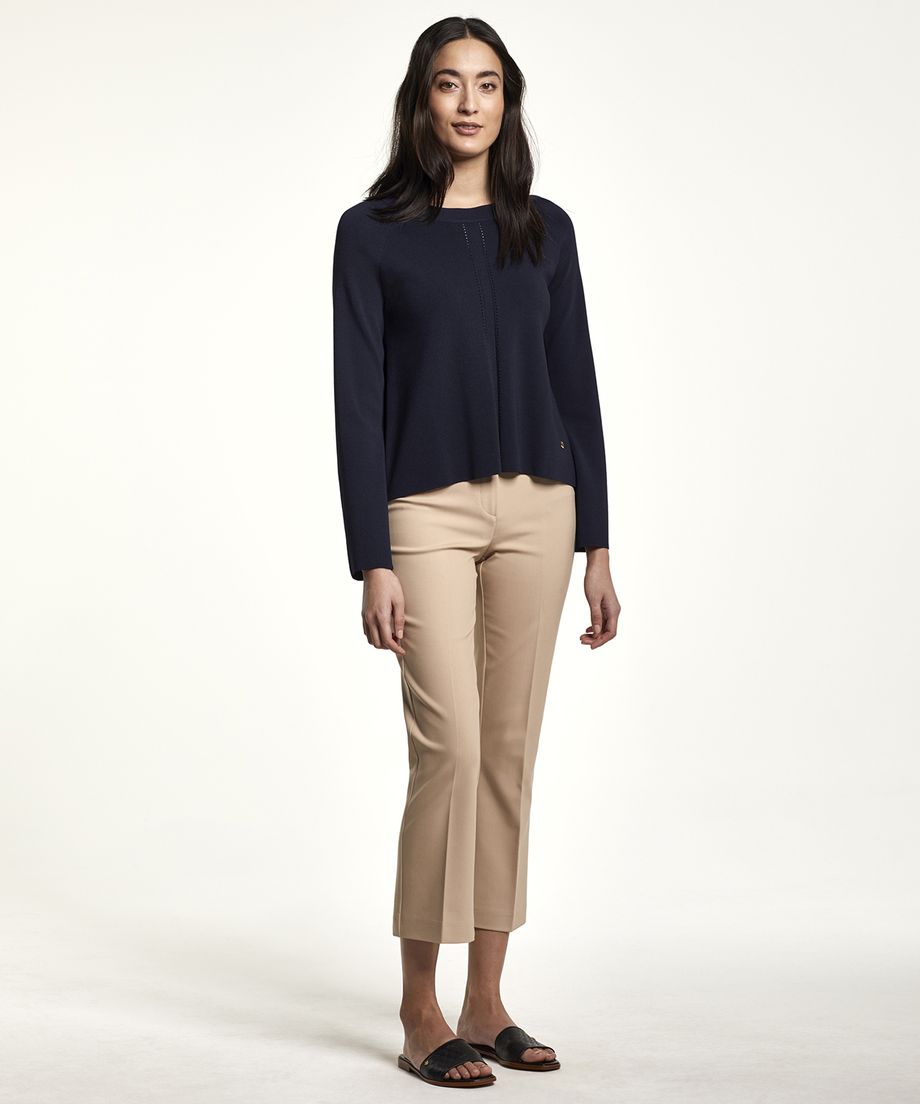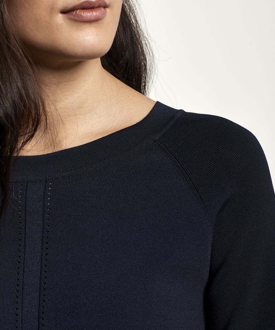 Knitted sweater with slight A-lined shape of the body and sleeve. The sweater has an elegant inverted box pleat at back. Decorative stitched stripes in a divergent knitting technique. Decorative knitted stripe at front in a divergent knitting technique together with pointelle stitching. Normal fit. Metal charm in gold metal placed at bottom hem.65% Viscose, 35% NylonHand washThe sweater is making a set together with Selina Knit Skirt. You can mix and match the skirt with Angilia Knit SkirtThe model is 180 cm and wears size S.