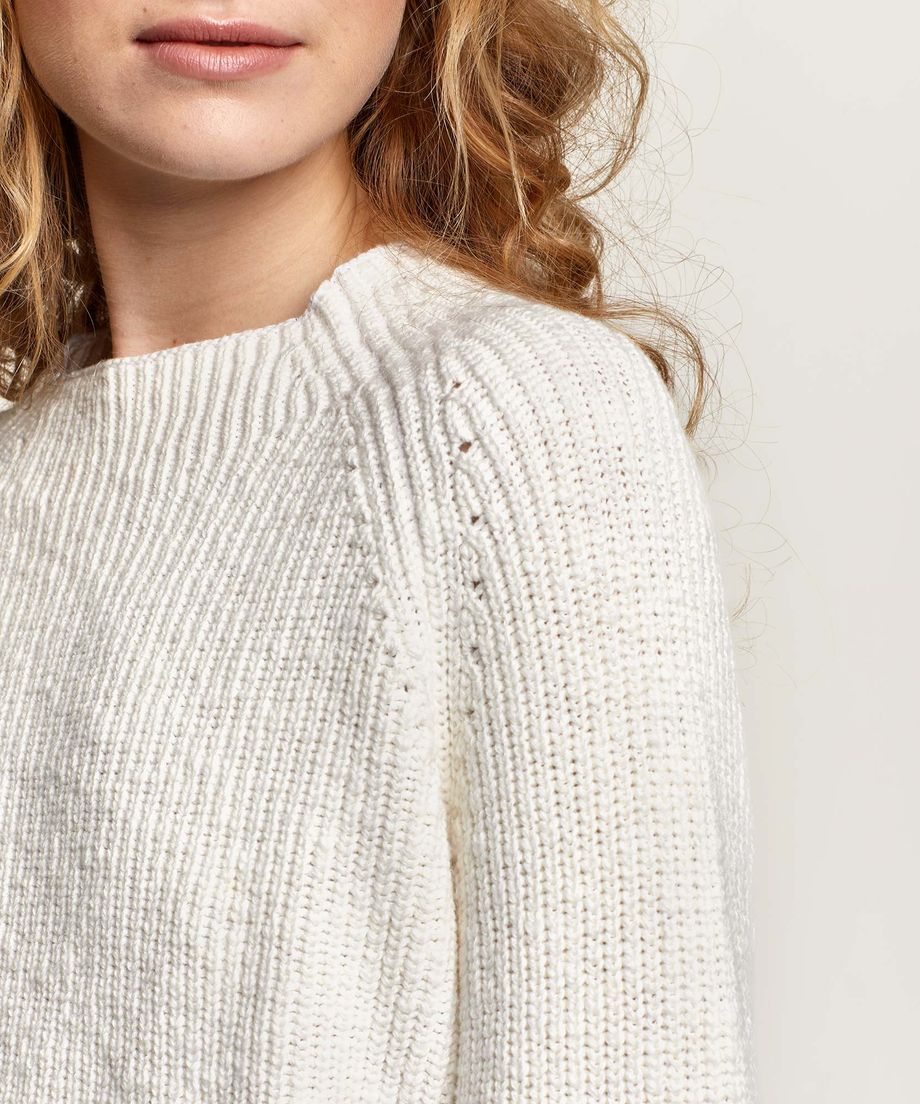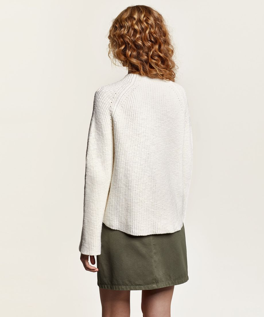 Knitted sweater with high neckline in a slightly wider and shorter fit. The sweater has a flattering A-lined shape of the sleeve. Decorative knitted hole pattern at front and back of the shoulder. Normal fit. Metal charm in gold metal placed at bottom hem74% Cotton, 26% LinenHand washThe model is 176 cm and wears size S.