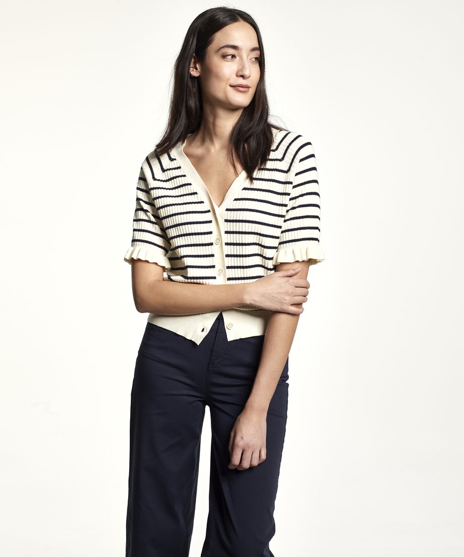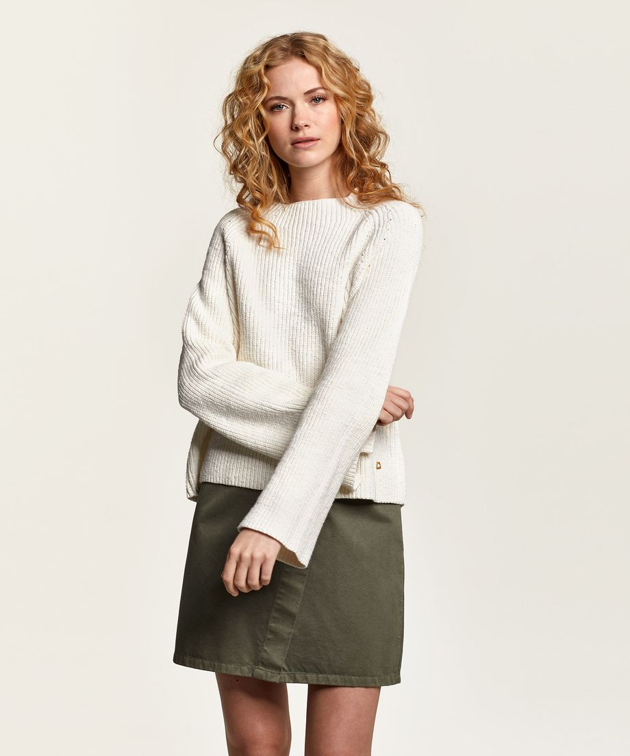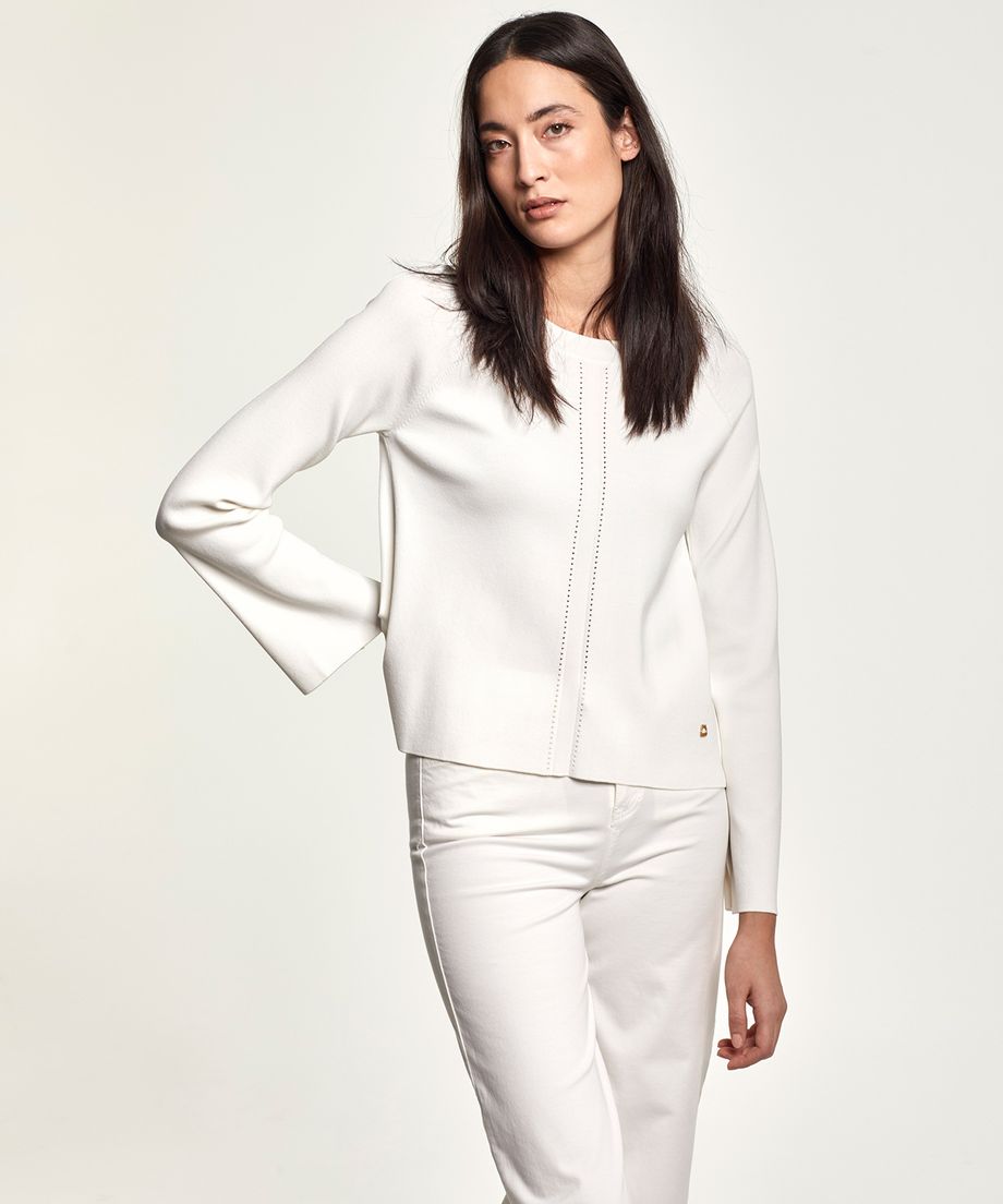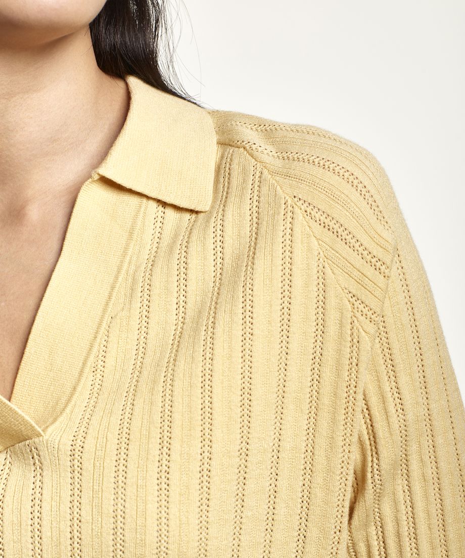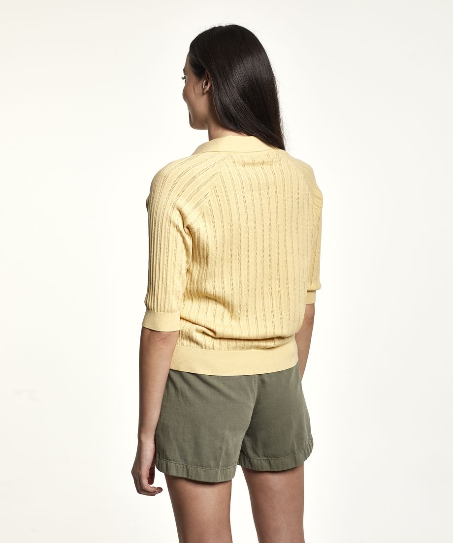 Knitted sweater in a slight shorter fit.with retro influences. The sweater has decorative knitted hole pattern, collar and short sleeve. Rib at sleeve and bottom hem. Metal charm in gold metal placed at bottom hem.72% Viscose, 28% PolyesterHand wash