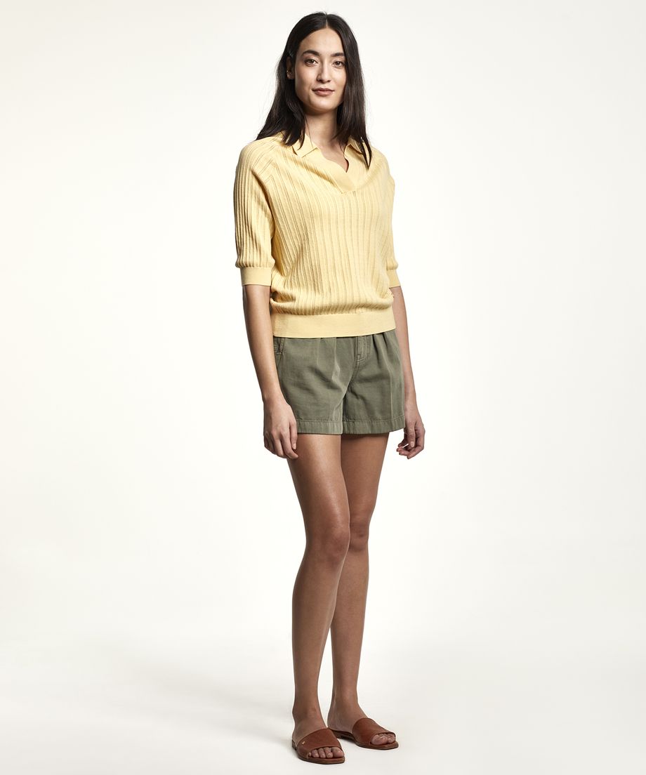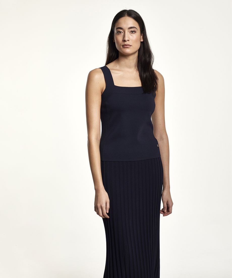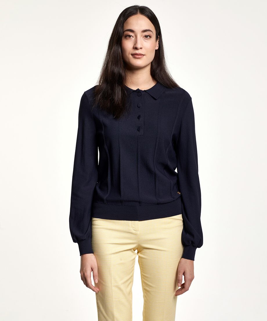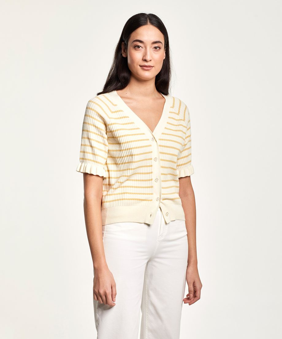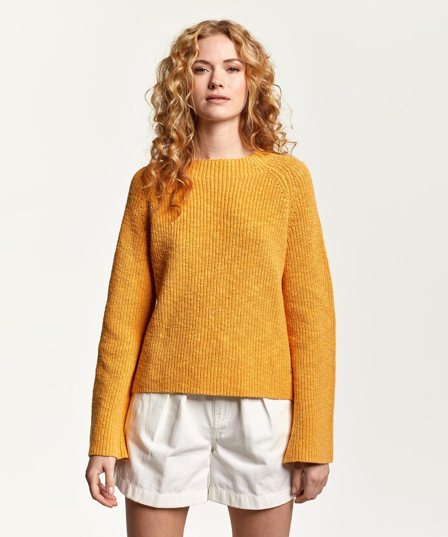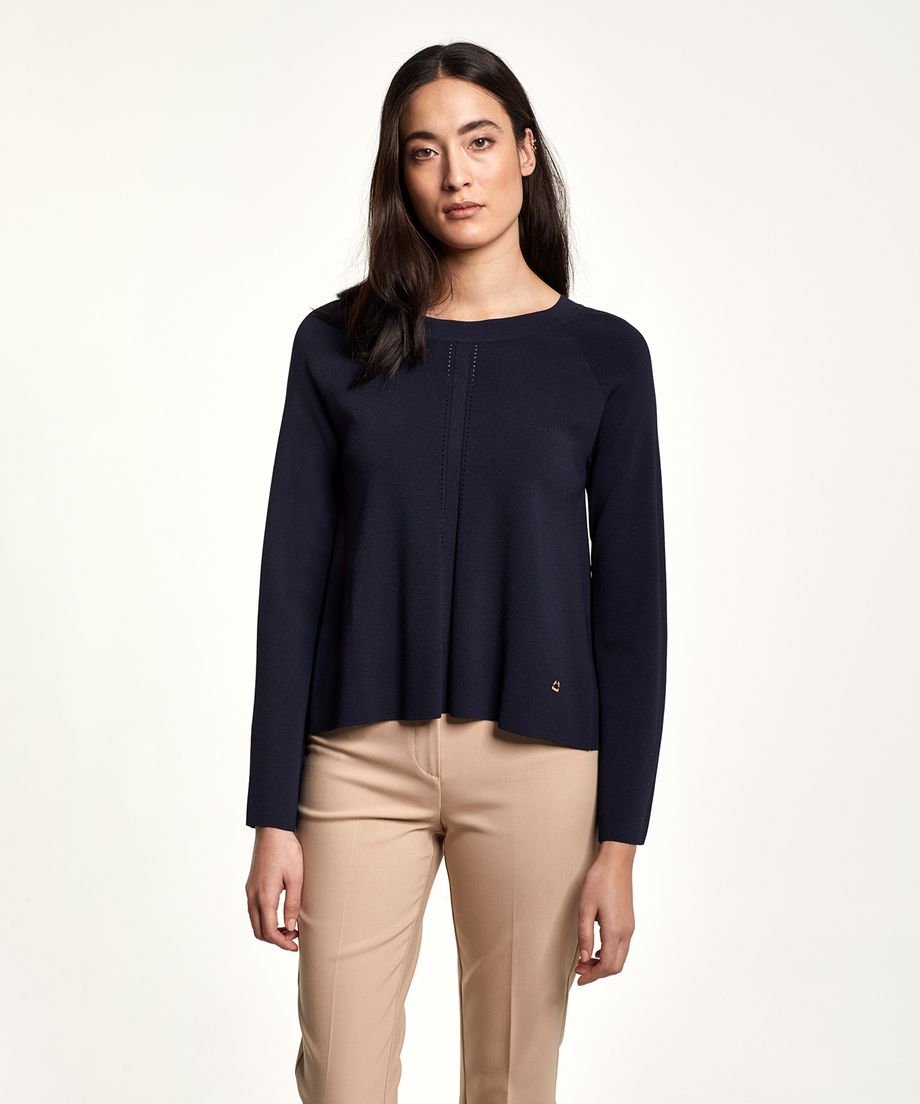 Knitted sweater in a slight shorter fit.with retro influences. The sweater has decorative knitted hole pattern, collar and short sleeve. Rib at sleeve and bottom hem. Metal charm in gold metal placed at bottom hem.72% Viscose, 28% PolyesterHand wash