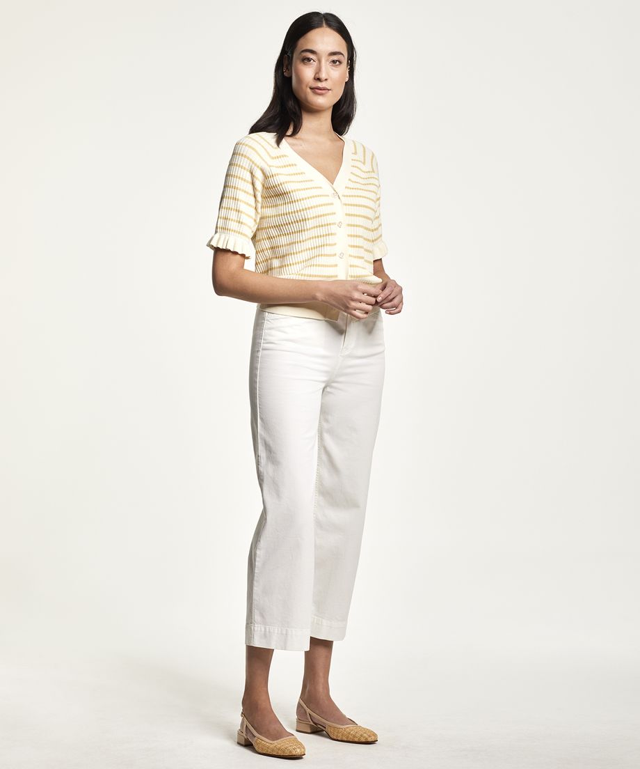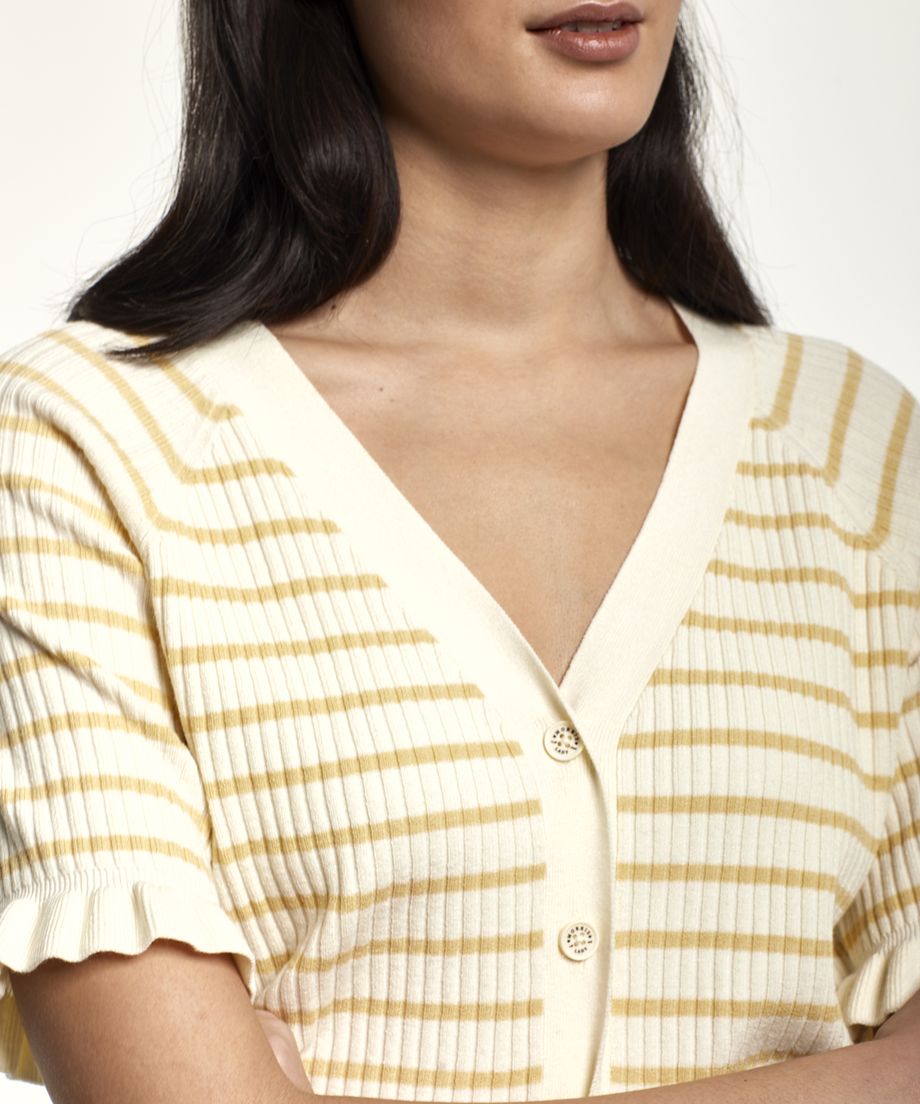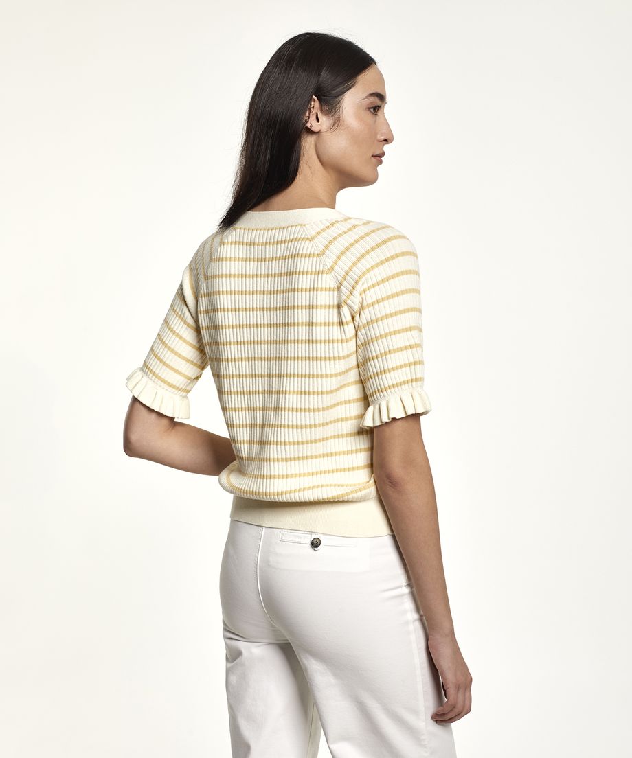 Ribbed sweater with V-neckline and buttons at front with a feminine silhouette, a new style in Lady’s assortment. The sweater has a short sleeve with a decorative frill at sleeve end. Normal fit. Metal charm in gold metal placed at bottom hem72% Viscose, 28% PolyesterHand washThe model is 180 cm and wears size S.