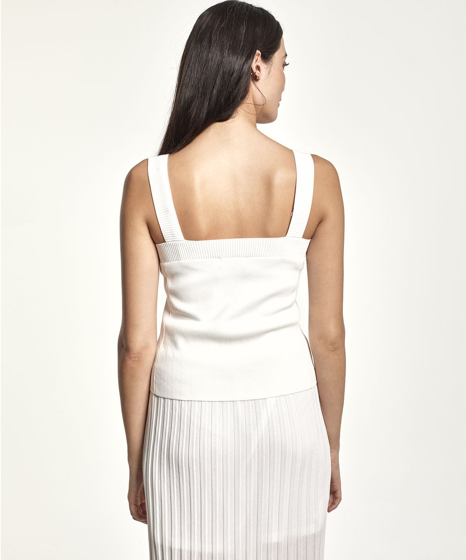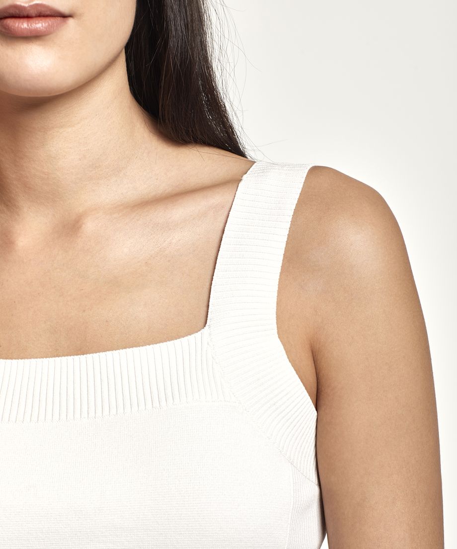 Knitted top in a shorter model.with decorative divergent knitting technique along the sides. The top has a flattering square neckline at front and back. Metal charm in gold metal placed at bottom hem.65% Viscose, 35% NylonHand washThe top is making a set together with Angilia Knit Skirt. You can also mix and match the top with Selina Knit SkirtThe model is 180 cm and wears size S.