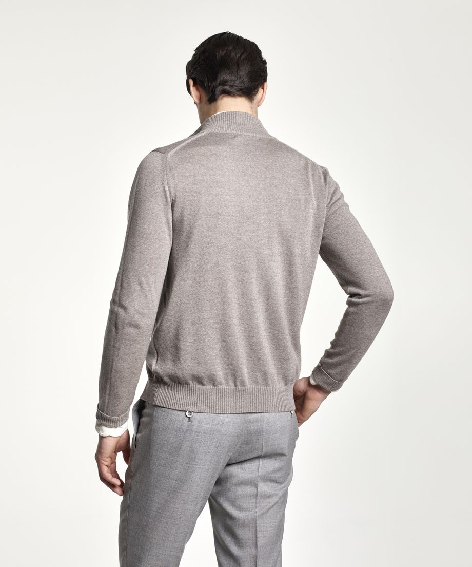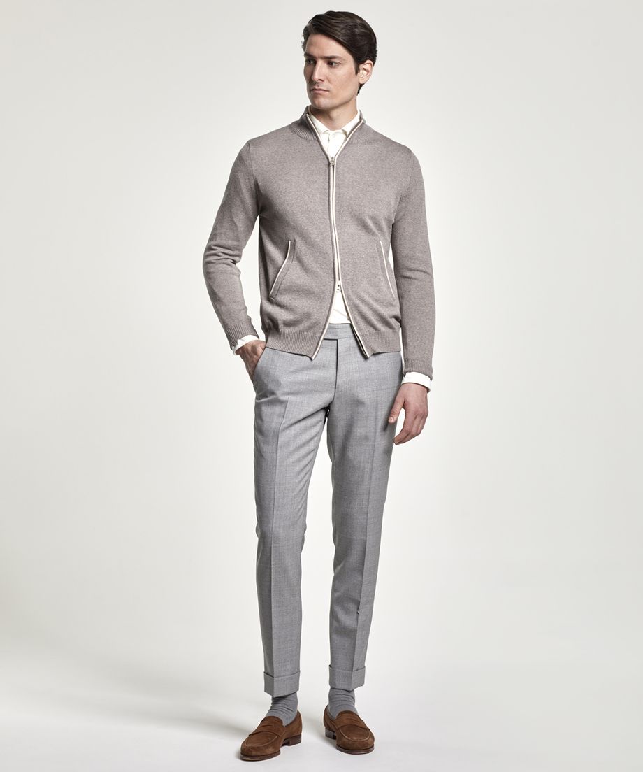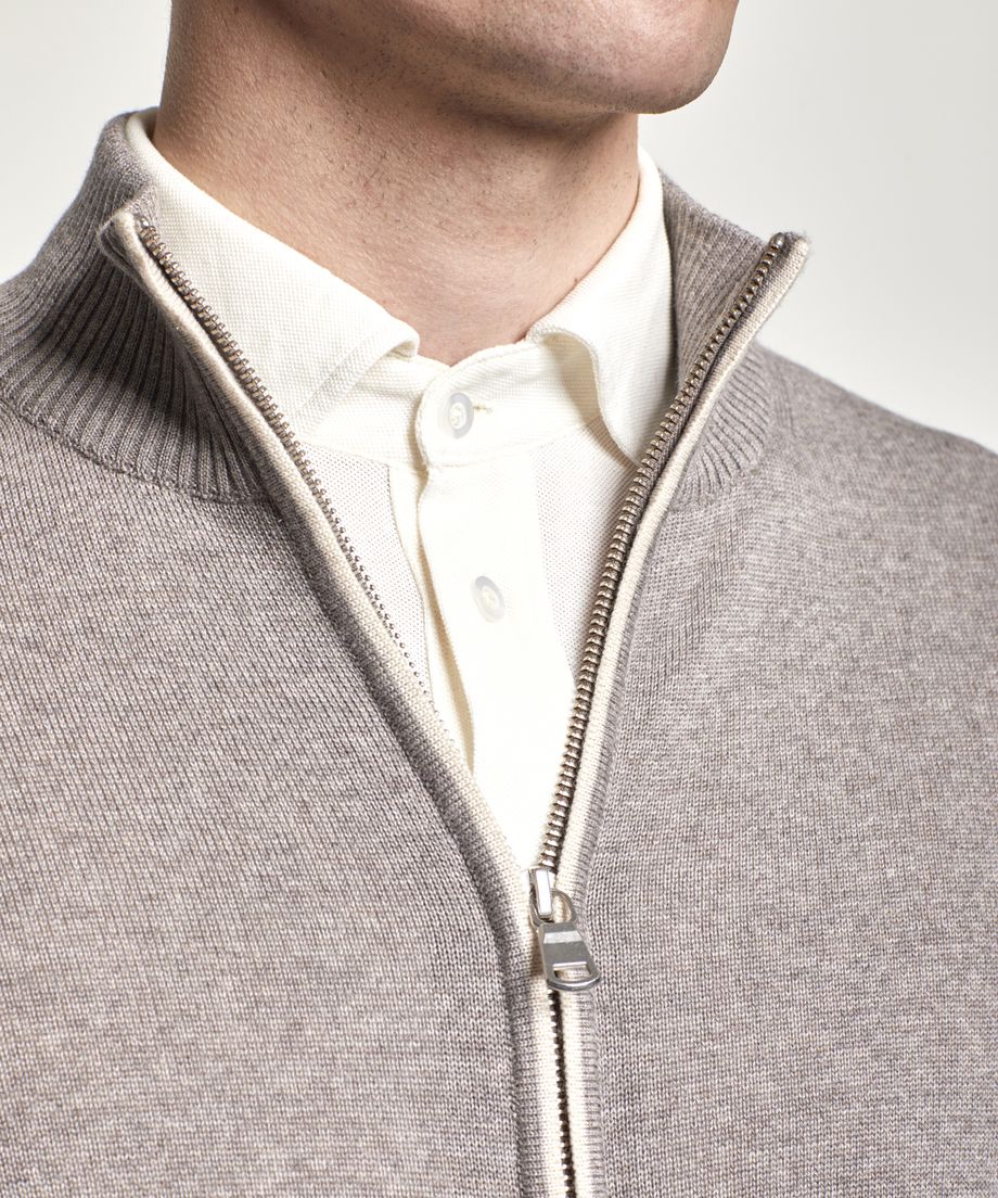 Fine knitted Premium cardigan made of an extra-fine and soft merino wool yarn from the Italian yarn producer Zegna Baruffa Lane Borgosesia. The cardigan has a funnel neck and closes with a two-way metal zipper. A decorative contrast coloured stripe is placed at centre front and along the pocket openings. Ribbed cuff and bottom hem. Normal fitTwo slanted pockets with are placed at front.100% Merino WoolHand washThe model is 190 cm and wears size M.