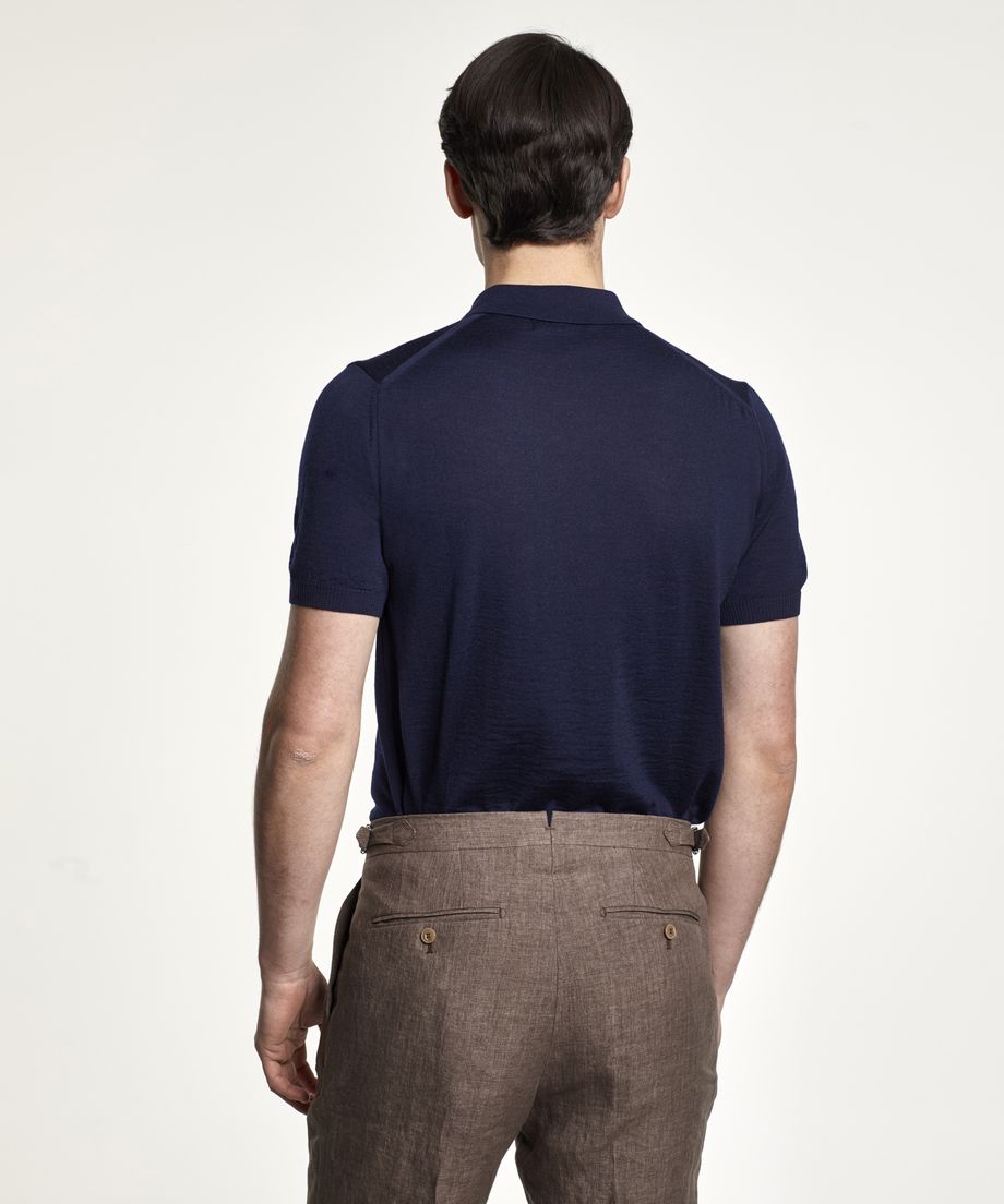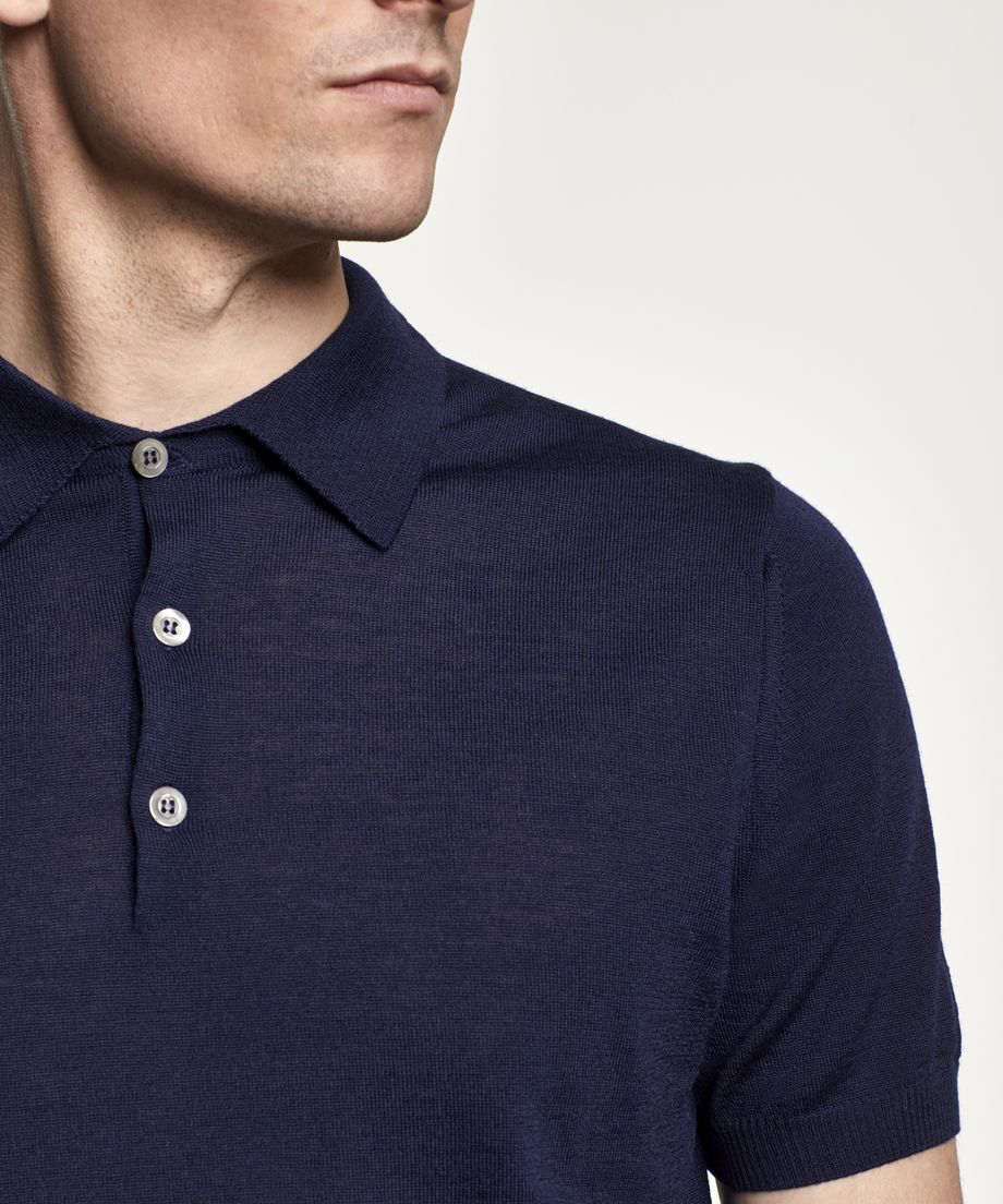 Premium fine knitted polo shirt with collar and button placket. Made of an extra-fine and soft merino wool yarn from the Italian yarn producer Zegna Baruffa Lane Borgosesia. The polo shirt has short sleeve, ribbed cuff and bottom hem. The buttons on the polo shirt are made of real Mother of Pearl. Normal fit100% Merino WoolHand washThe model is 190 cm and wears size M.